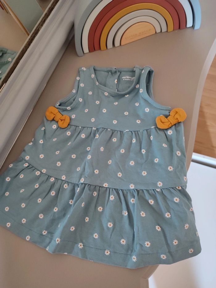 Magnifique robe bleu/gris avec marguerites VERBAUDET. 6 mois. Portée une seule fois, parfait état, aucun défaut. Petit noeud jaune moutarde de chaque côté. Se ferme par pressions à l'arrière de la robe. #6mois_macys76