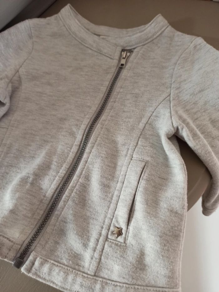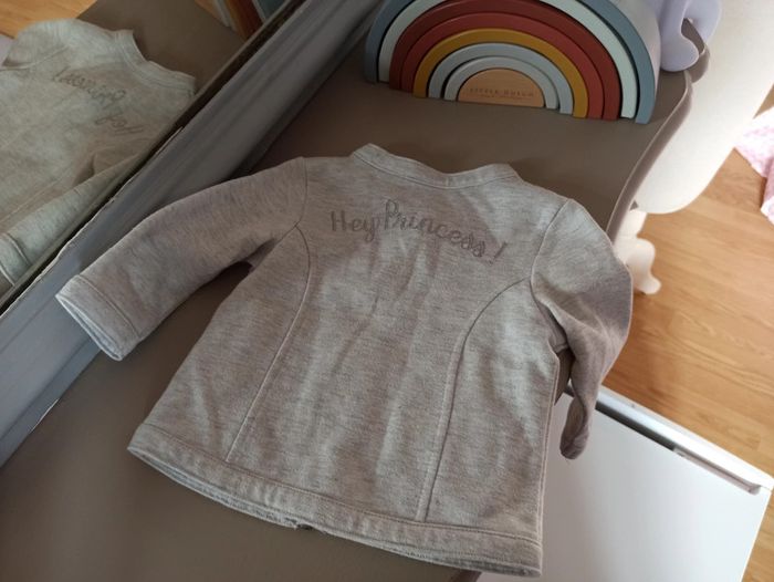 Très belle veste zippée grise pailletée TAPE À L'OEIL. 6 mois. Très bon état, portée 3 fois max. Couleur grises chinée pailletée. Inscription grise pailletée "Hey Princess" au dos. #6mois_macys76