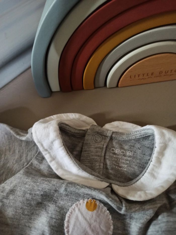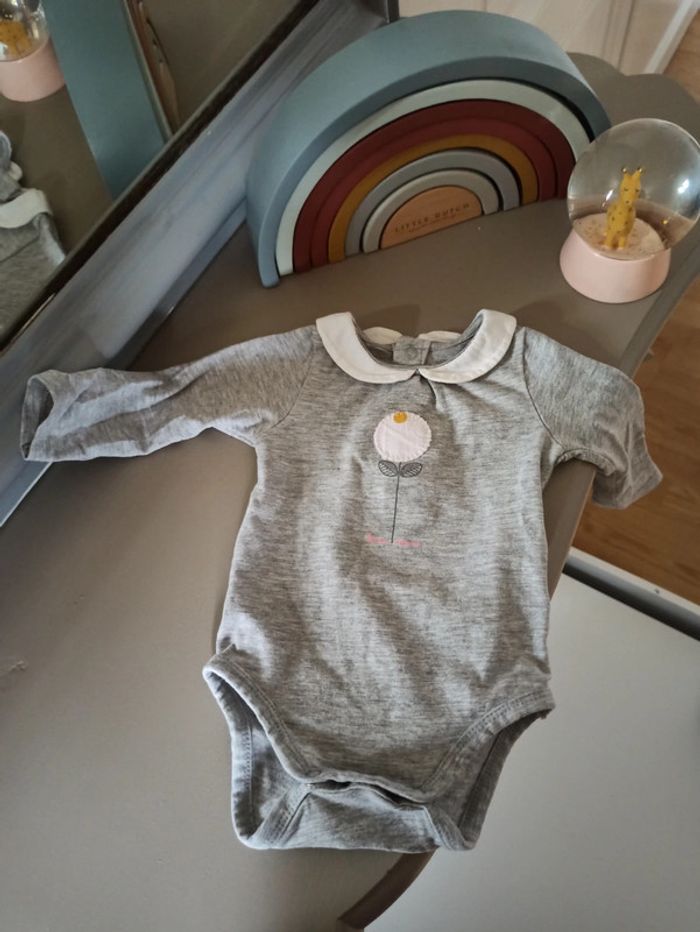 Adorable petit body gris chiné avec col blanc OBAIBI. 3 mois. Parfait état, porté deux fois seulement car rotation avec de nombreux autres bodys. Très joli petit motif sur le devant. S'ouvre et se ferme par pressions à l'arrière et en bas du body. #3mois_macys76