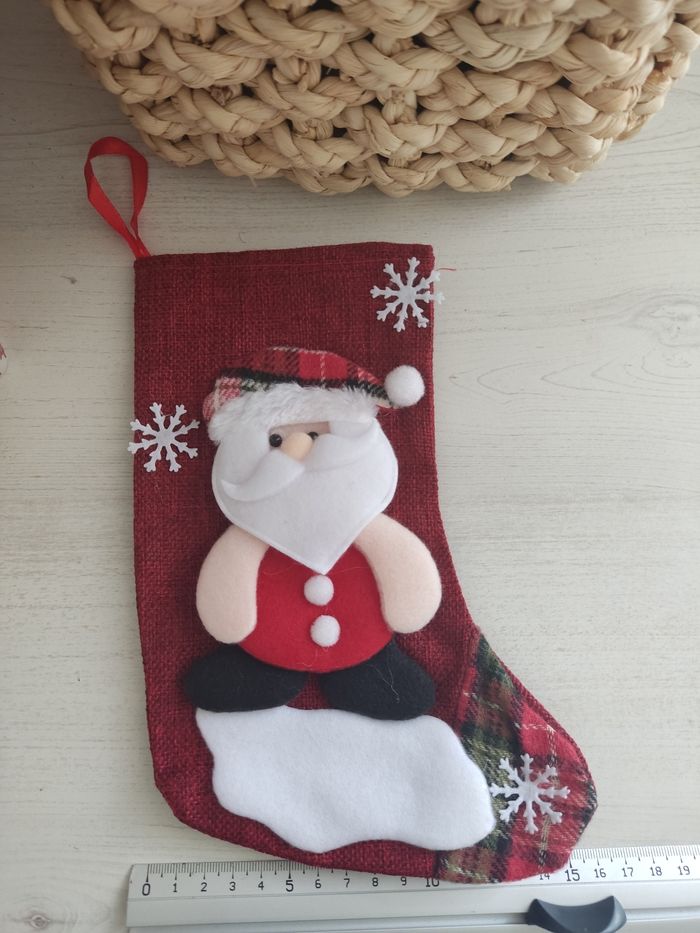 Chaussette de Noël à suspendre motif Père Noël. Dimension : 21 cm x 15 cm. Tissu et feutrine. Neuf