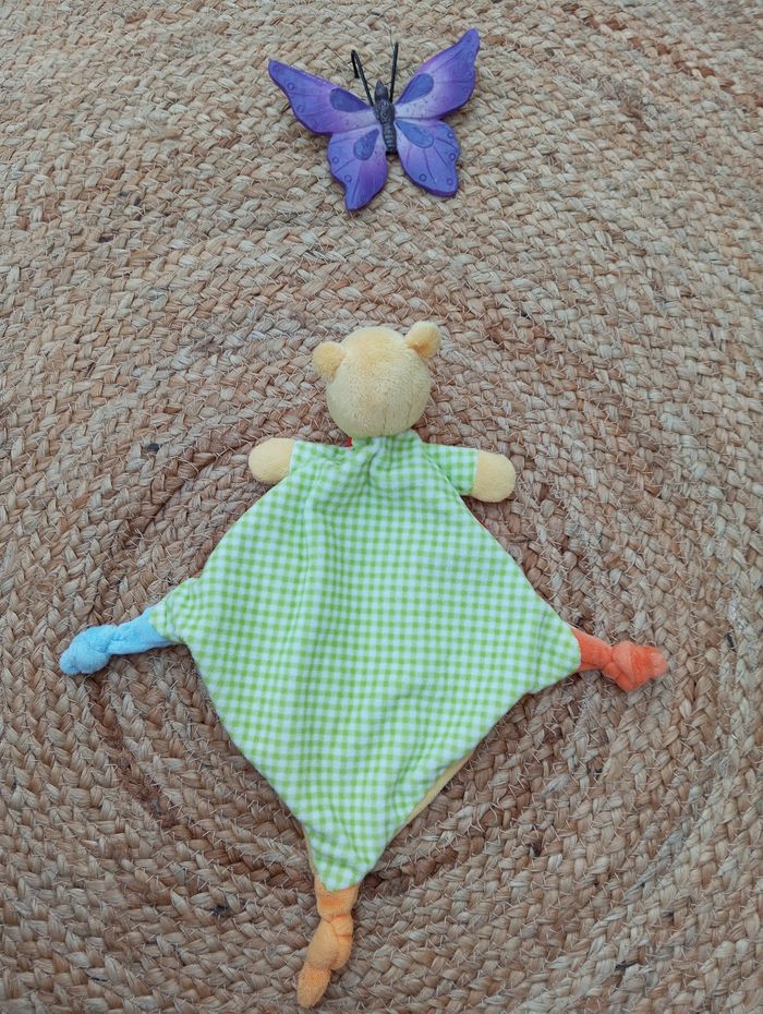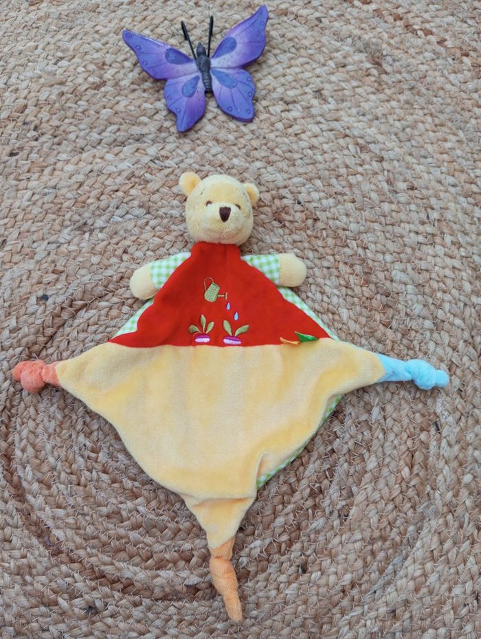 #DCR_disney #DCR_ours Disney baby Doudou winnie l'ourson Jaune rouge Vichy vert Broderies radis arrosoir Étiquette de composition absente C009