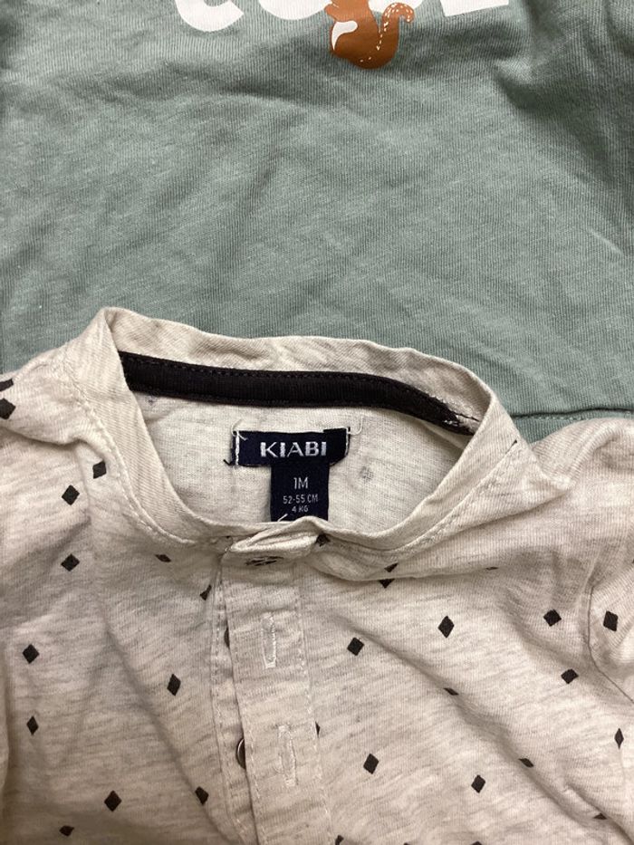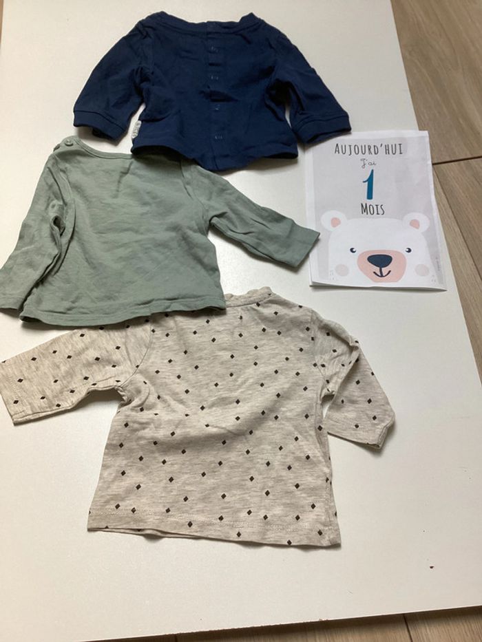 3 tee-shirts manches longues : -un bleu avec pressions au dos -un vert avec bouton à l’épaule -un beige avec boutons devant Très bon état, pas de tache ni de trou. #hermy76bebe1mois