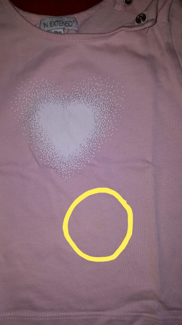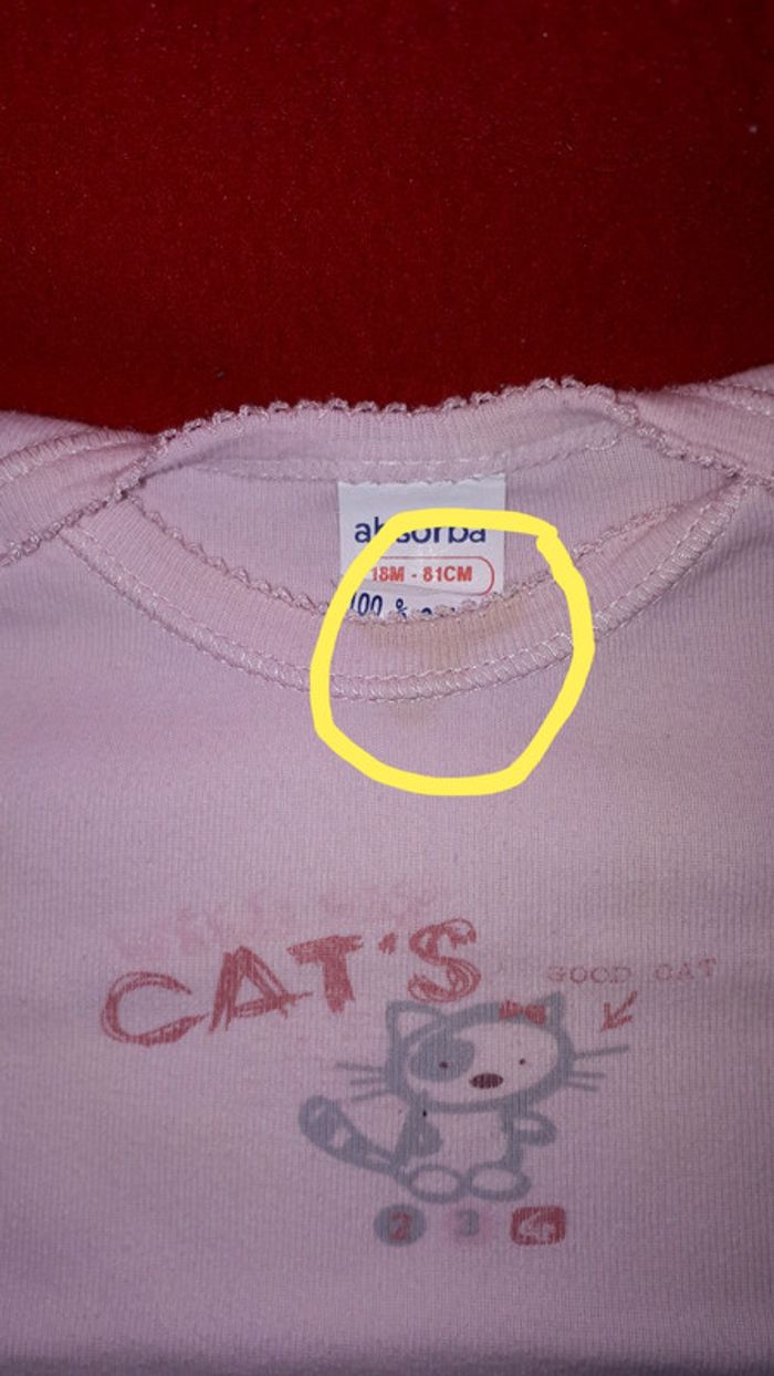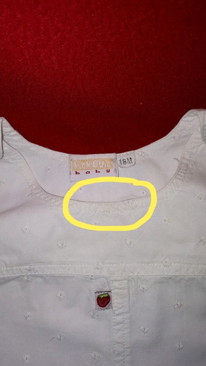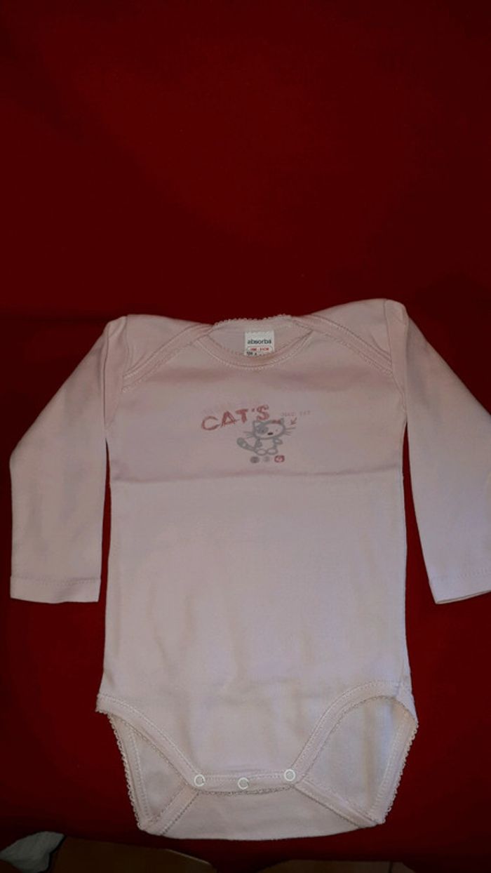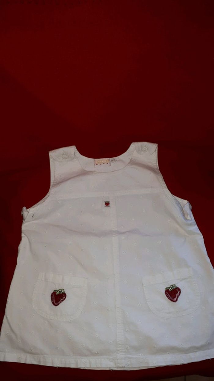 ●1 body manches longues rose clair motif chat, taché voir photo 3 ●1 t-shirt manches courtes rose clair avec coeur blanc, pression à l'épaule, légère tâche voir photo 5 ●1 robe blanche motif fraises, jaunie légèrement, voir photo 7 #18moisfilleevaura76