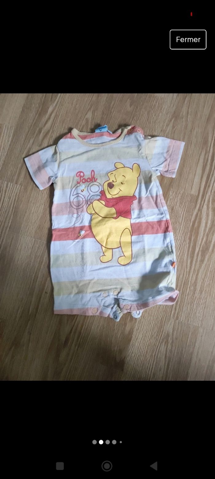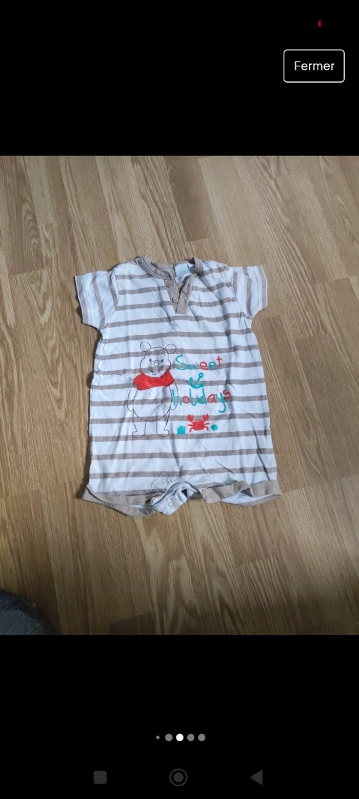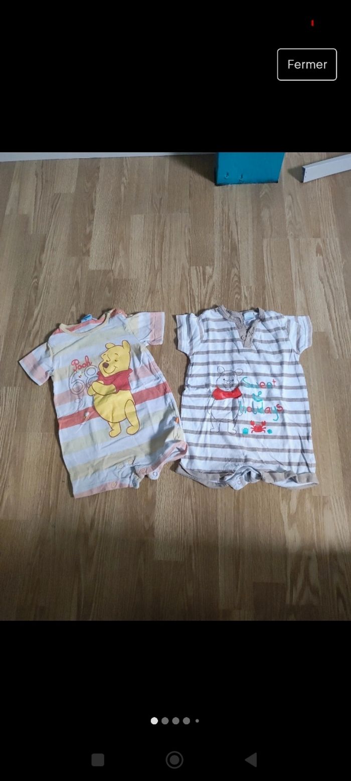 Lot de 2 combi short garçon taille 9 mois Celui de gauche est taché et un peu craquelé Celui de droite un peu taché Voir photo Winnie l'ourson