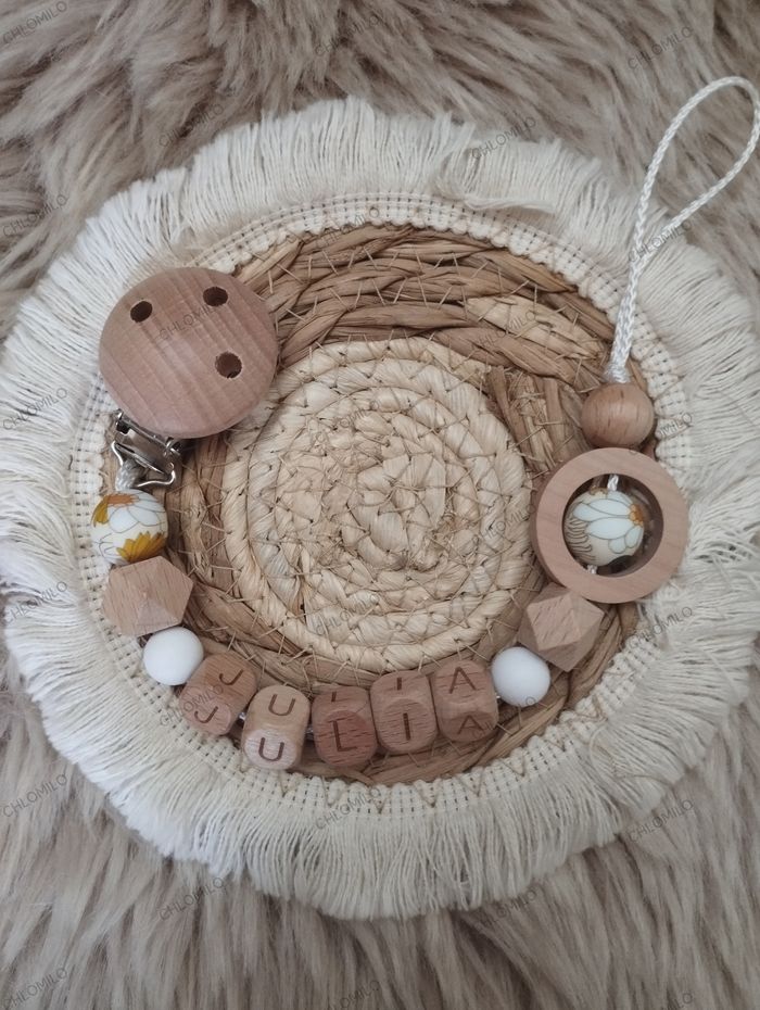 Attache tétine personnalisée Bois naturel et silicone alimentaire Sans BPA ni autres substances toxiques Différents coloris possibles