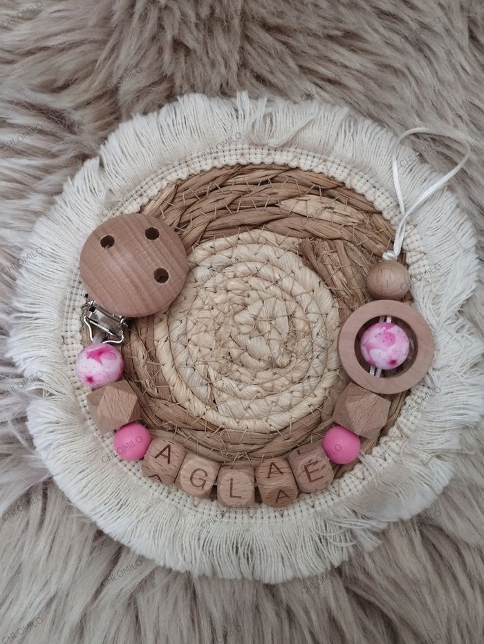 Attache tétine personnalisée Bois naturel et silicone alimentaire Sans BPA ni autres substances toxiques Différents coloris possibles