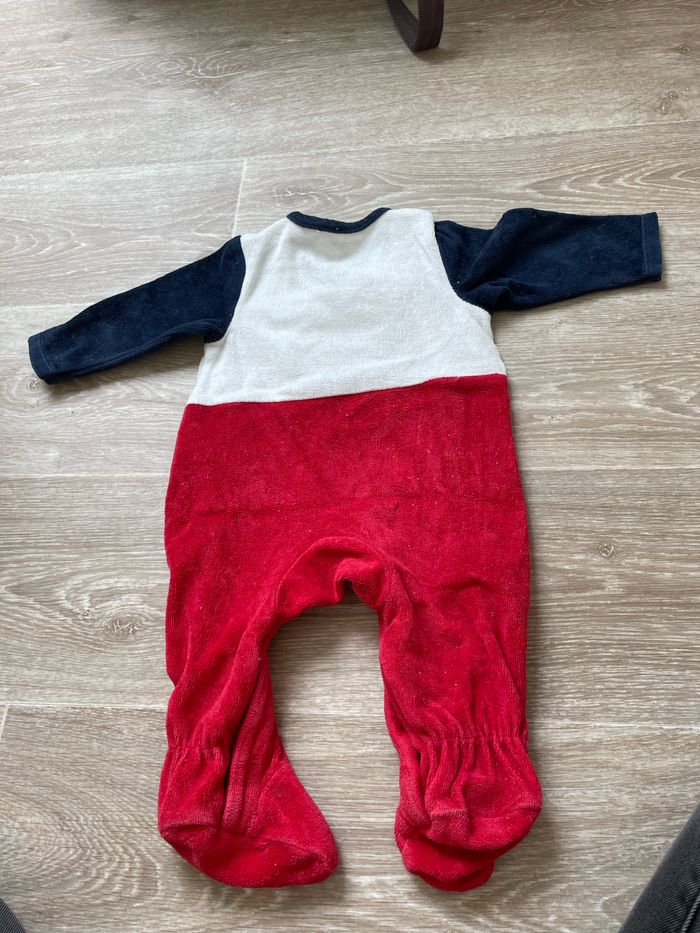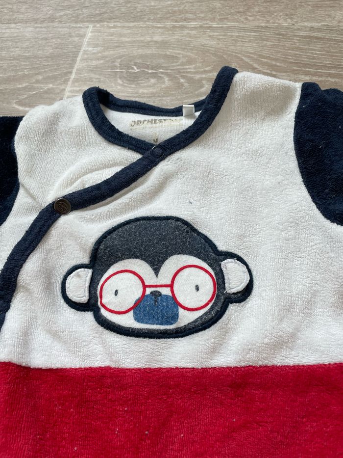 Pyjama, en velours de la marque orchestra en très bon état. Taille trois mois, il est juste légèrement bouloché au niveau de la tête du singe.