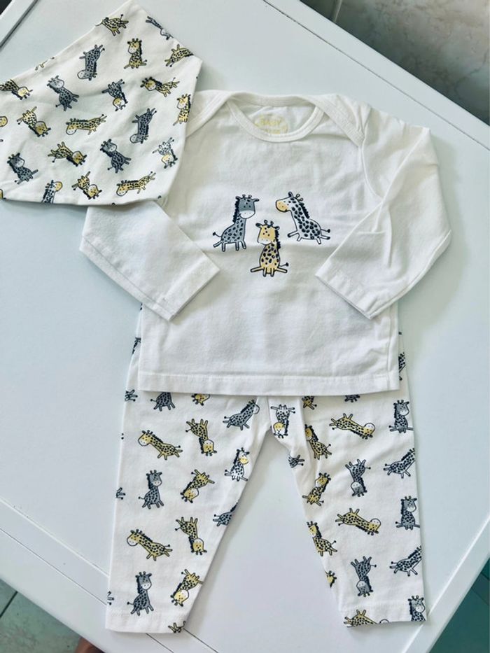 Ensemble 3 pièces comprenant : bandana, teeshirt, pantalon Taille 62-68cm Motif girafe Totalement neuf, vendu dans son emballage d’origine