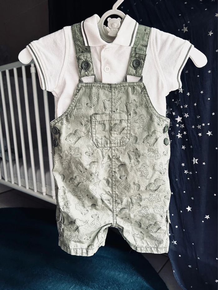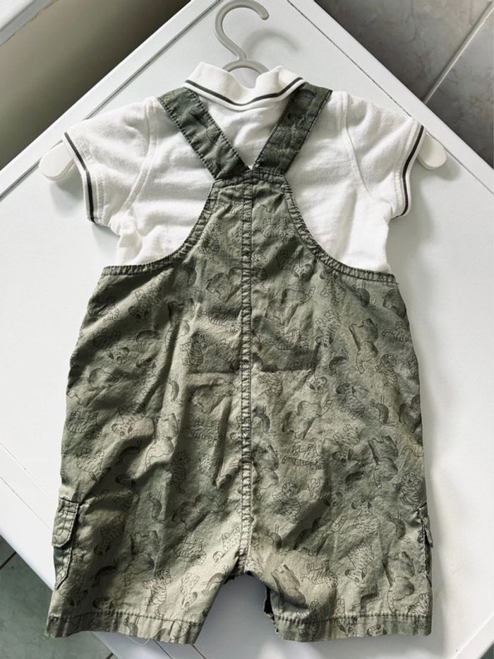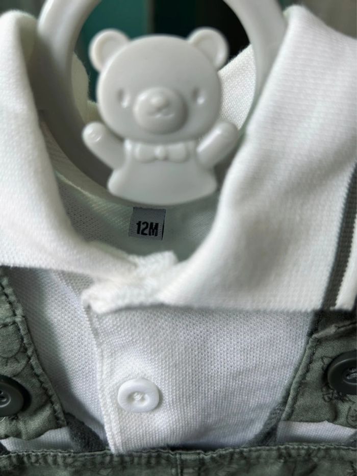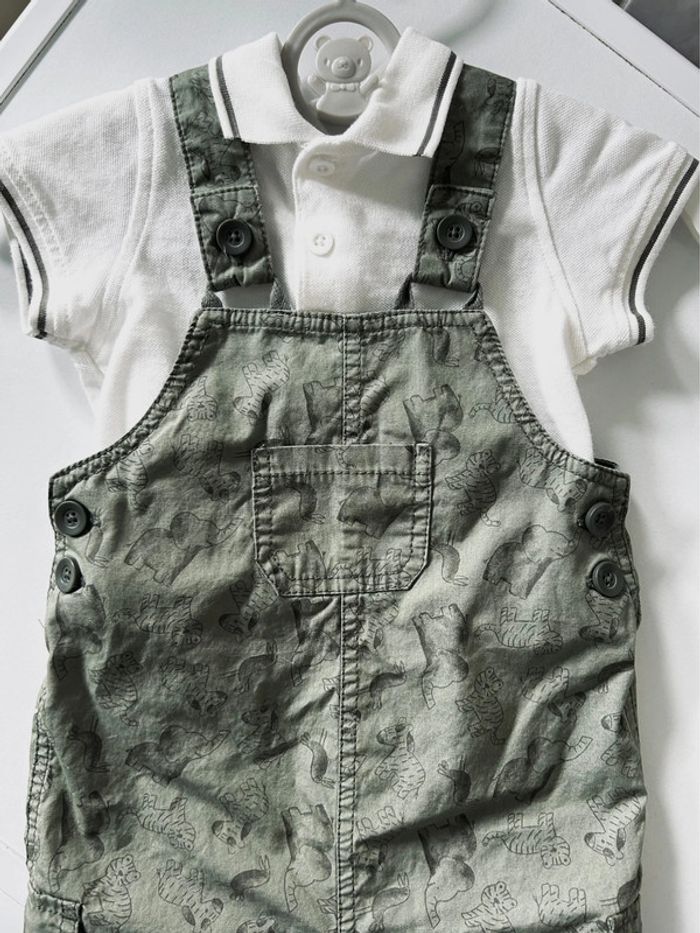 Ensemble de la marque PLUS Collection Polo + salopette Taille 12 mois Thème savane, couleur kaki Totalement NEUF, il a simplement été lavé