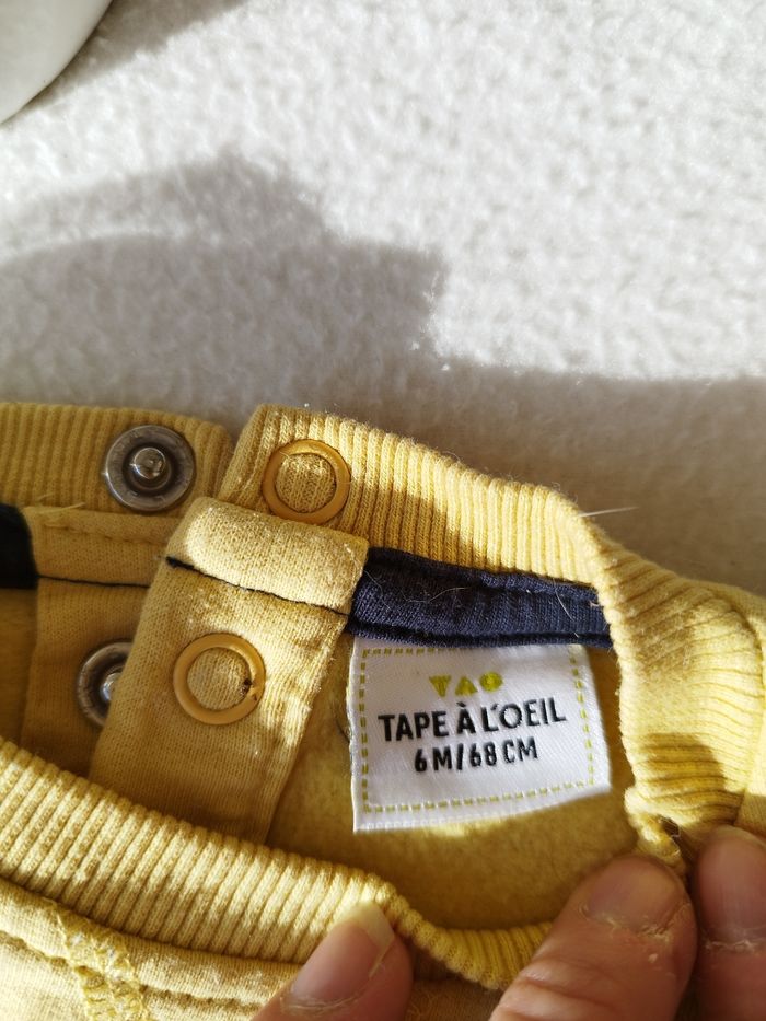 Vend pull de couleur jaune avec motif de la taille 6mois de la marque tape a l'oeil en très bonne état