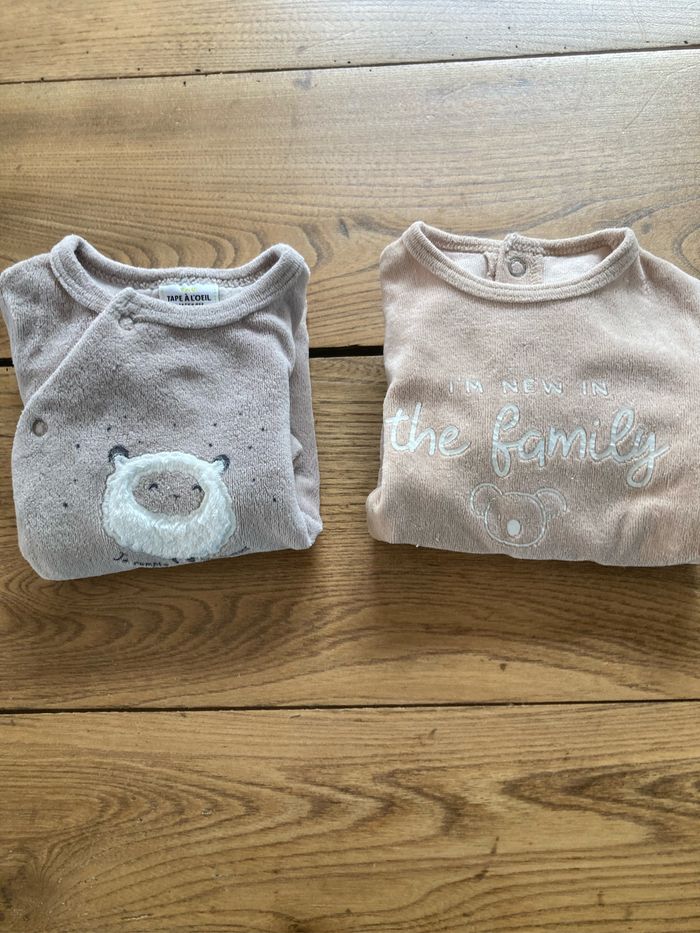 2 pyjamas hiver 1 mois bon état 1 marque Kiabi avec ouverture par l’arrière 1 marque tape à l’œil avec ouverture sur l’avant