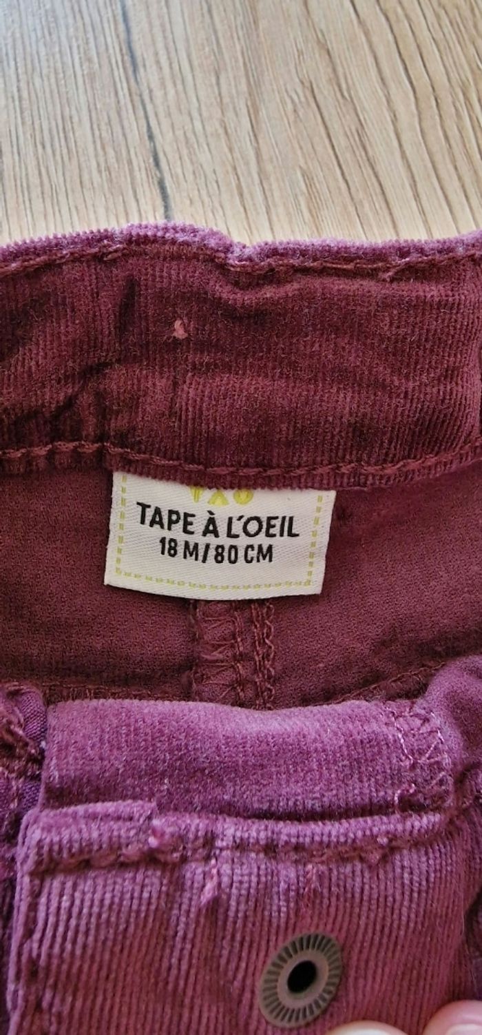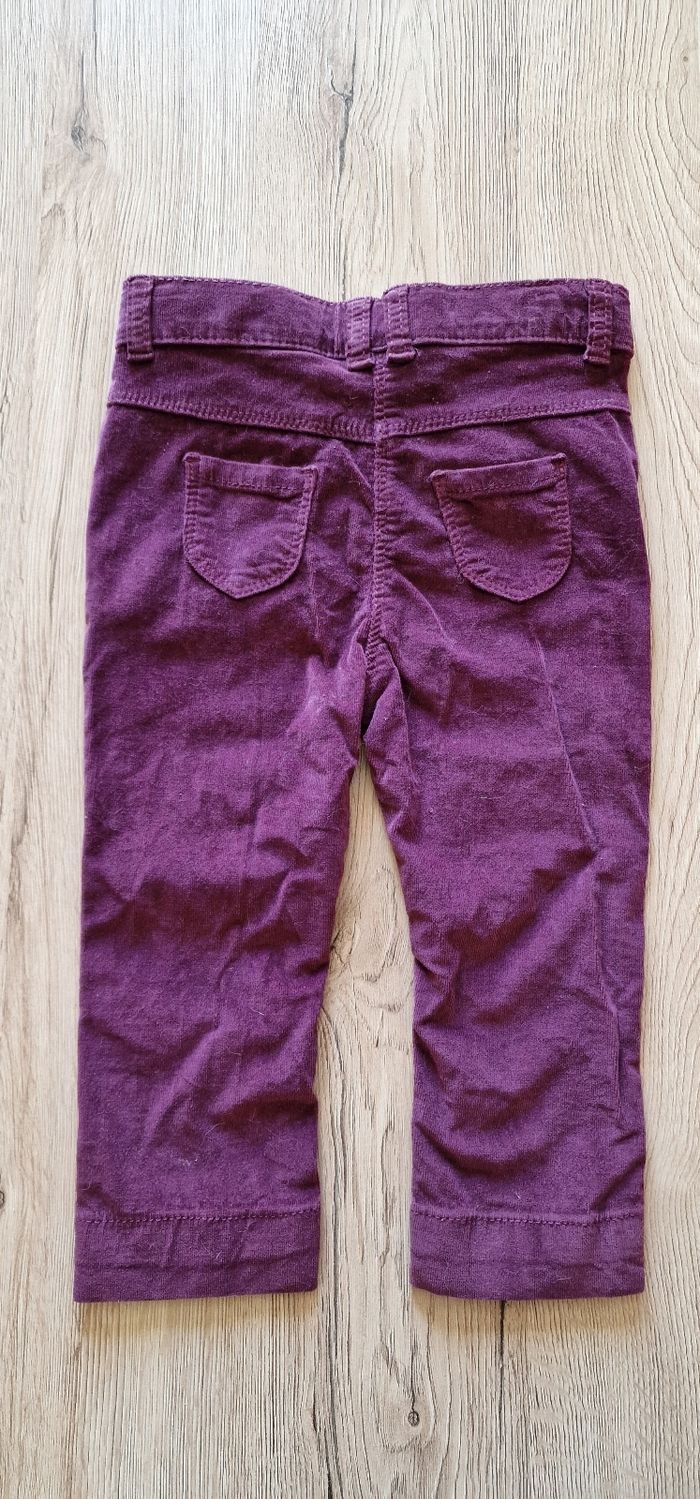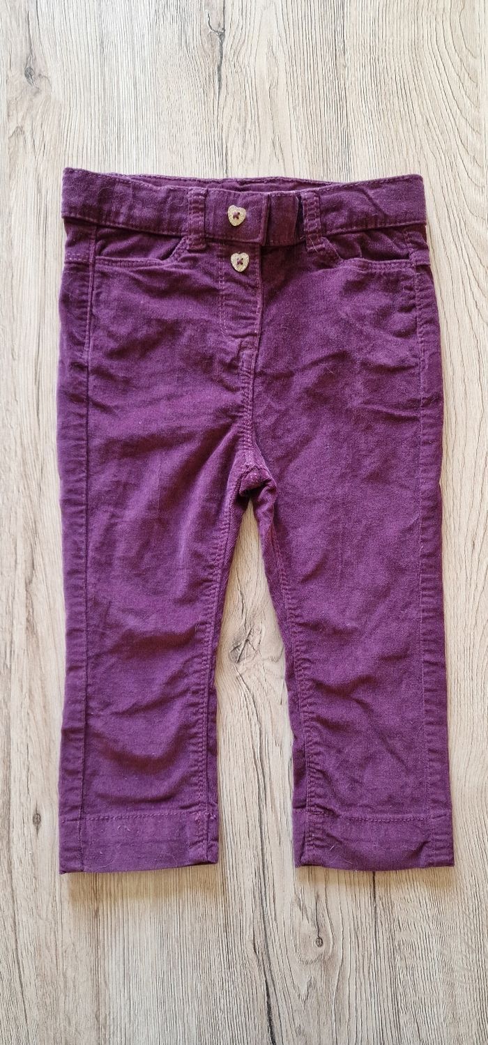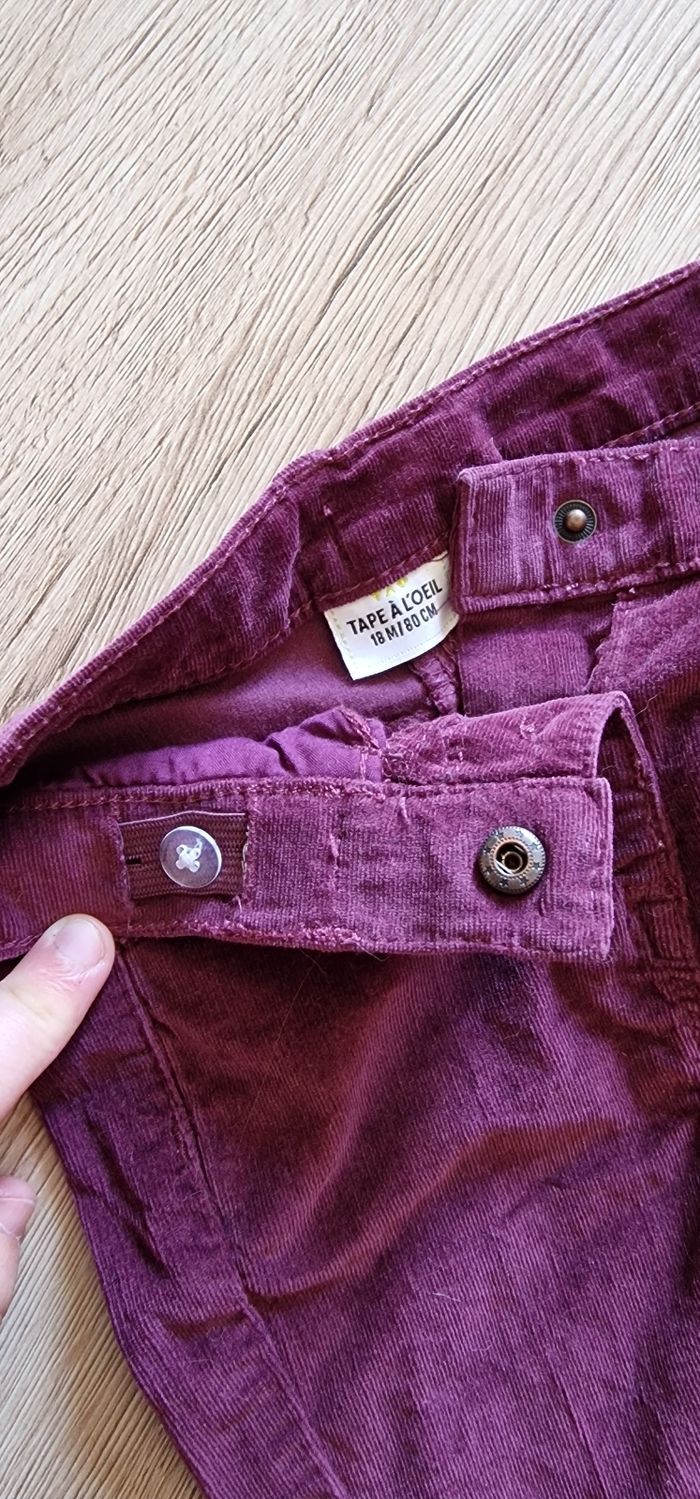 Pantalon en velours violet légèrement côtelé. Réglable à la taille. Se ferme avec un bouton pression, plus facile pour les petits. État : Neuf jamais porté Taille : 18 mois Marque : Tape à l'œil
