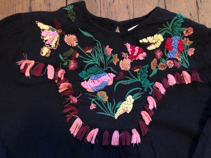 Robe noire Zara brodée fleurs 11 ans Broderies fleurs et pompons volants au bas de la robe boutonnée dans le dos coton très confort