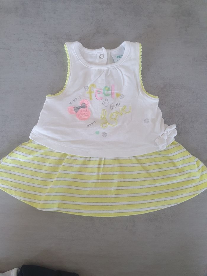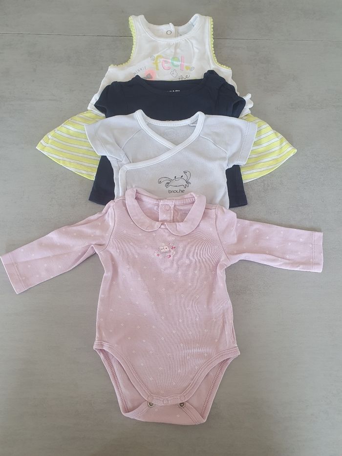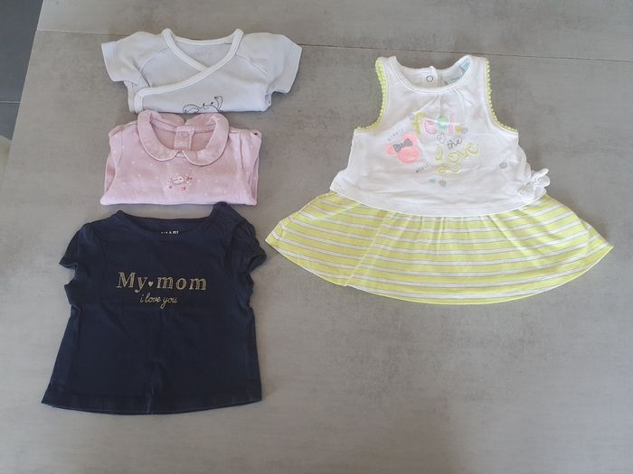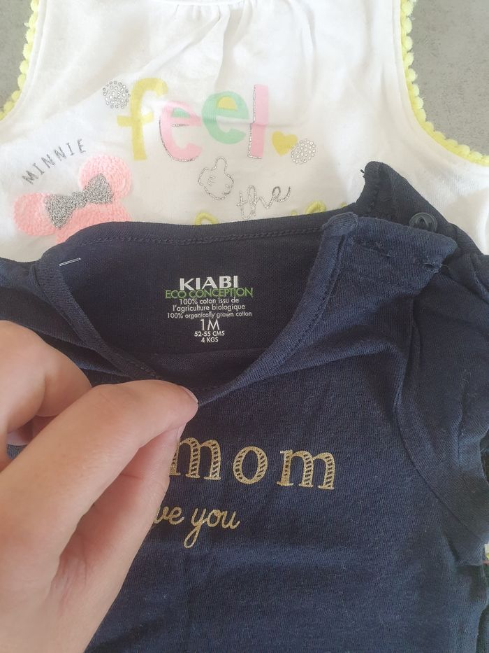 Lot fille 4 pièces : - 1 body ML col habillé "mon premier major" - 1 body MC brioche - 1 t-shirt My mom i love you "kiabi" - 1 jolie robe Disney baby minnie mouse Le tout en très bon état et taille 1 mois