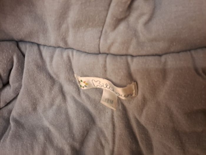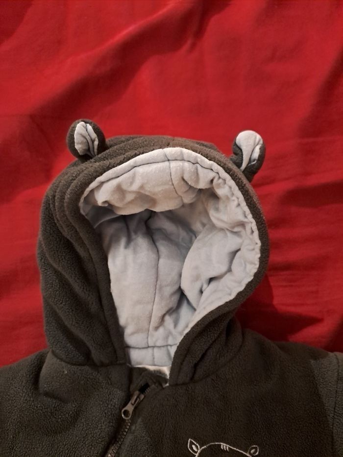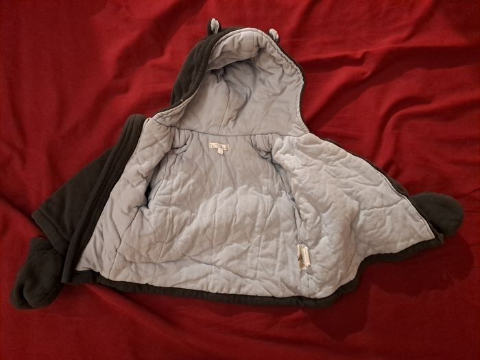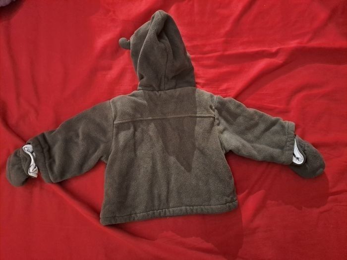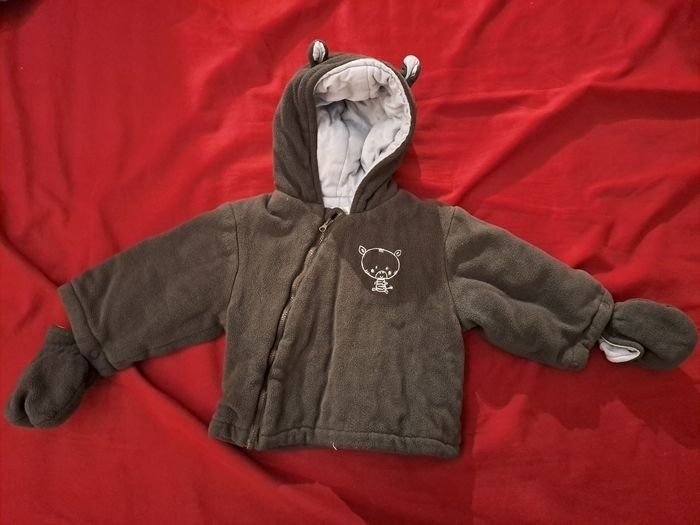 Manteau en 18 mois. Polaire à l'extérieur. Il y a des gants qui peuvent s'enlever avec les pressions. Déjà mis et reste en très bon état. Non repassé.