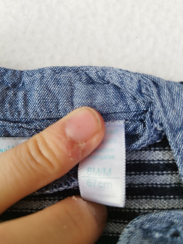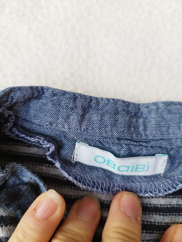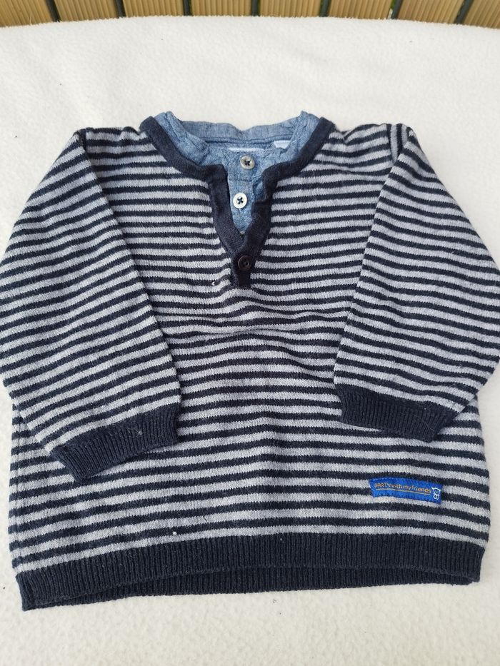 Vend pull fin de couleur bleu marine avec rayure grise de la marque obaibi de la taille 6 mois en très bonne état