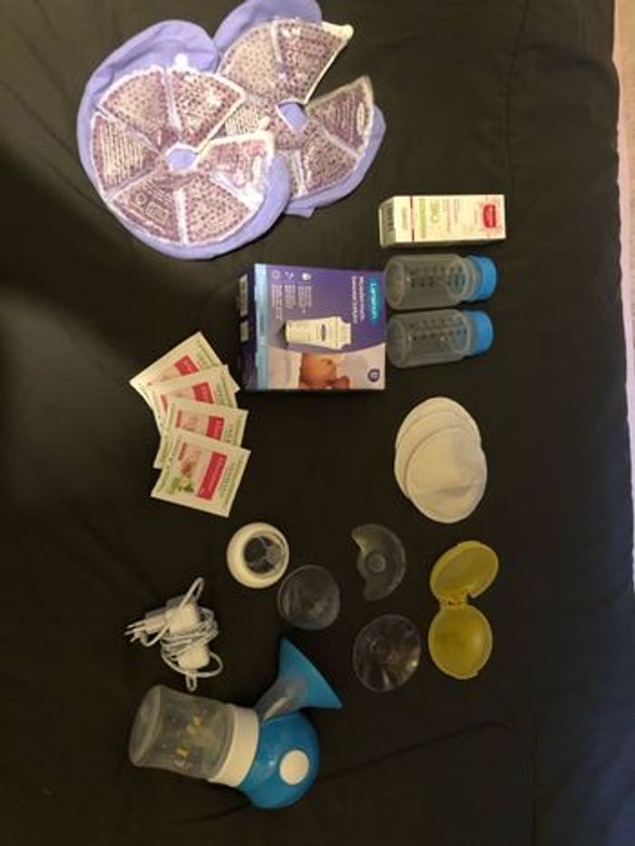 1 crème 2 récipients pour récolter et conserver le lait maternel 3 coussinets en coton lavables 2 embouts en silicone 1 tire-lait avec biberon (a piles ou sur secteur-pratique lors à transporter) 4 sachets de tisane allaitement Sacs de congélation lait maternel 2 poches chaud/froid