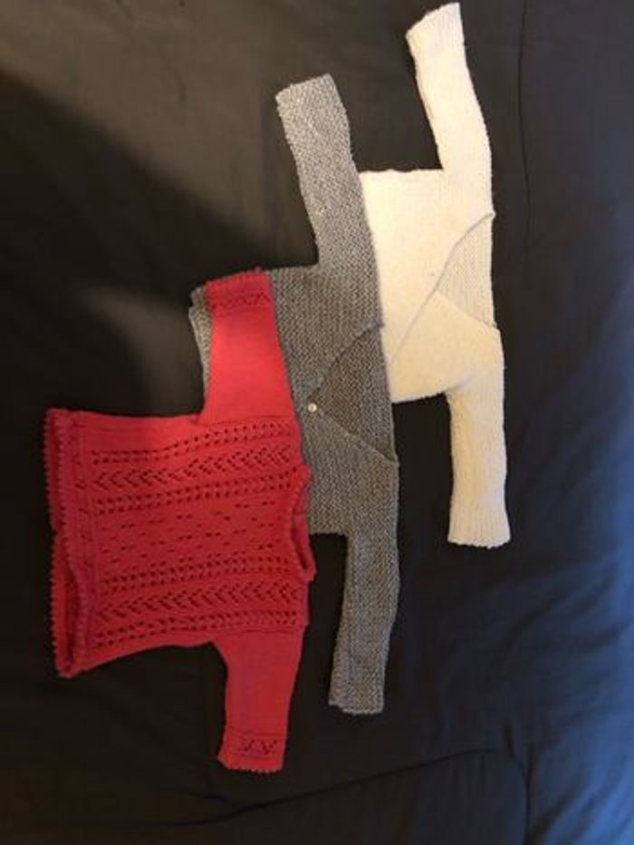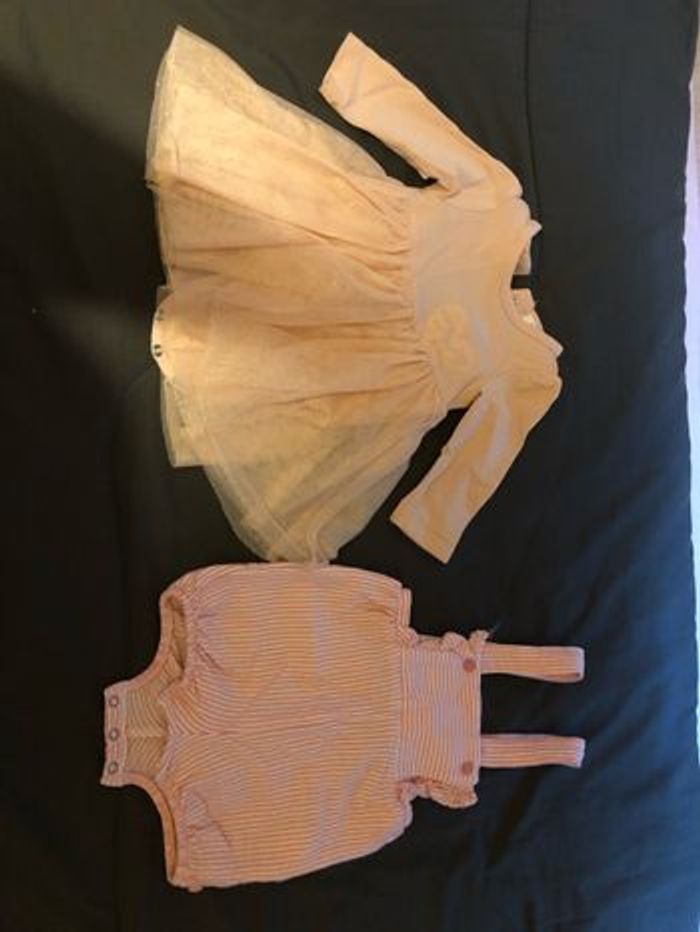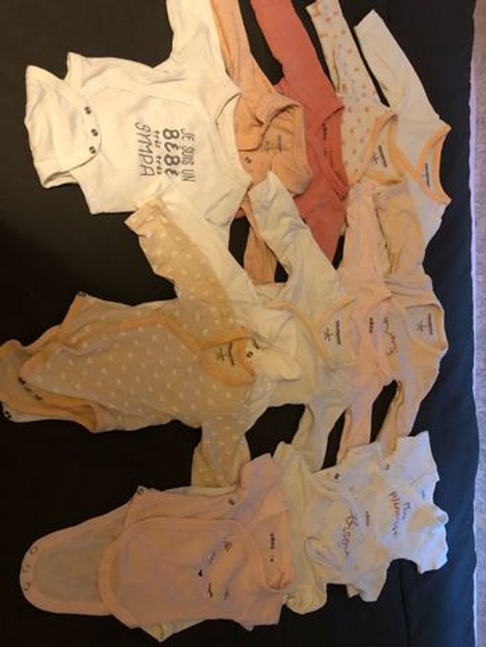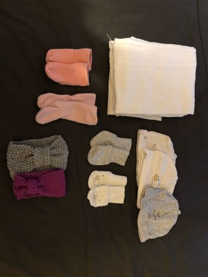 6 pyjamas 10 bodies manches longues 4 bodies manches courtes 1 robe et 1 salopette 3 brassières de laine 2 langes 3 bonnets 2 paires de moufles 2 paires de chaussettes 2 bandeaux en laine