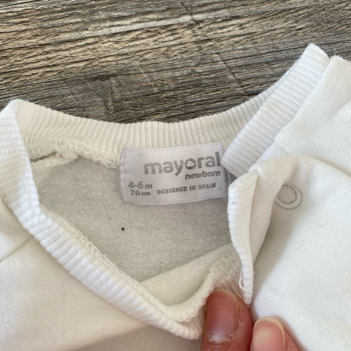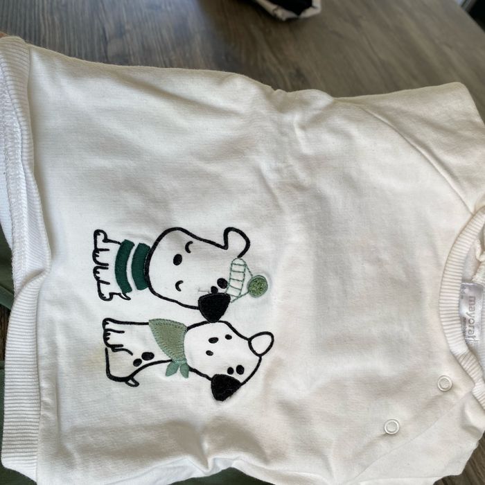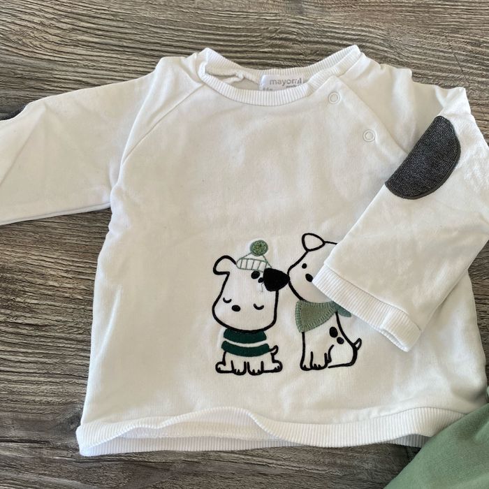Ensemble haut manches longues + jogging Légères taches sur le haut (voir photos) Sinon bon état général Taille 4/6 mois