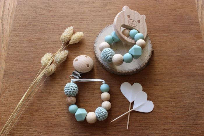 Coffret cadeau bébé composé d'un attache tétine et d'un hochet de dentition. Confectionné à la main dans mon atelier au Mans. Attache tétine L'attache tétine en bois est un accessoire indispensable pour bébé (et pour ses parents !) : il garde précieusement à portée de main la tétine de bébé. SECURITE : Modèle testé en laboratoire et certifié conforme aux normes en vigueur. Hochet de dentition Ce hochet de dentition pour bébé lui permettra de : * Soulager ses poussées dentaires * Éveiller ses sens grâce aux différentes textures, formes et couleurs des perles * Développer sa motricité à l'aide des anneaux qu'il pourra s'entraîner à attraper, à faire glisser le long des perles et à faire tinter en secouant le hochet SECURITE : Modèle testé en laboratoire et certifié conforme aux normes en vigueur. 13 COLORIS AU CHOIX (à indiquer en commentaire de votre commande - Voir photo 2 de gauche à droite) : 1 Chair 2 Rose sucré 3 Rose poudré 4 Terracotta 5 Rose boudoir 6 Pêche 7 Moutarde 8 Mangue 9 Eucalyptus 10 Gris vert 11 Menthe 12 Bleu poudré 13 Bleu pastel