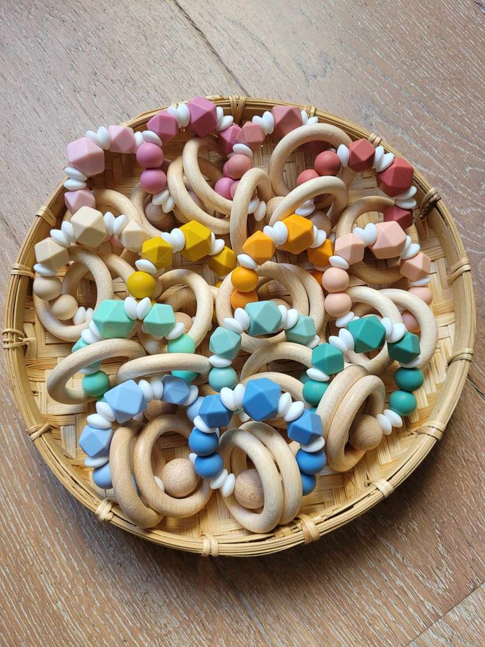 Ce hochet de dentition pour bébé lui permettra de : * Soulager ses poussées dentaires * Éveiller ses sens grâce aux différentes textures, formes et couleurs des perles * Développer sa motricité à l'aide des anneaux qu'il pourra s'entraîner à attraper, à faire glisser le long des perles et à faire tinter en secouant le hochet Confectionné à la main dans mon atelier au Mans. COLORIS (A indiquer en commentaire de votre commande - Voir photo 2 de gauche à droite) : 1 Rose poudré 2 Rose sucré 3 Rose boudoir 4 Terracotta 5 Chair 6 Moutarde 7 Mangue 8 Pêche 9 Menthe 10 Vert lin 11 Eucalyptus 12 Bleu pastel 13 Bleu poudré CONFORMITE Modèle testé en laboratoire Conformes aux normes EN 71-1:2014 + A1:2018 et EN 71-2:2011 + A1:2014 SECURITE Avant de le proposer à votre enfant, vérifiez toujours l'intégrité du jouet en vous assurant notamment de la bonne tenue des nœuds d'attache. Retirez-le de la portée de votre enfant dès les premiers signes de détérioration ou de fragilité. COMPOSITION Bois de hêtre naturel, non traité Silicone sans BPA et conforme aux normes européennes en vigueur (NF EN -71-3/A3:2018)