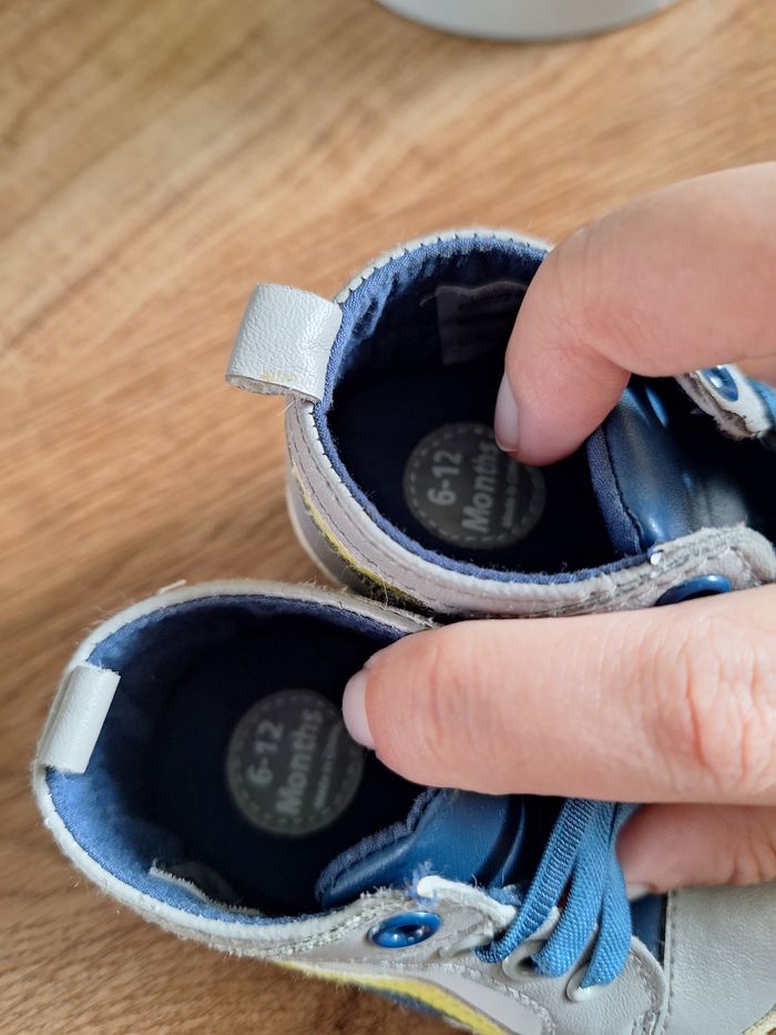 Chaussures pour petits garçon taille 6-12 mois Couleurs : bleu, gris, blanc et jaune. Jamais portées par contre il y a des rayures sur la semelle je ne sais pas pourquoi (ce sont des touts petits accrocs)