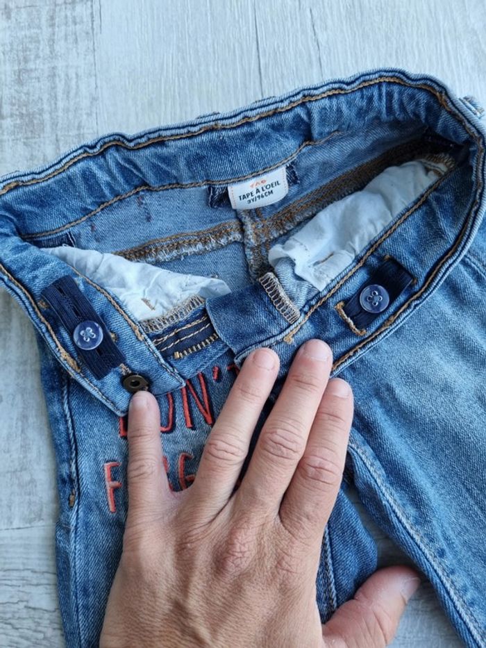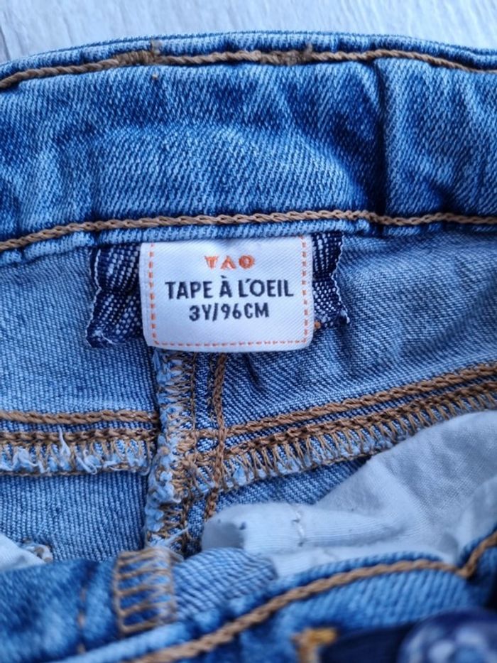 Jeans effet usé (acheté comme ça!) Taille 3 ans Taille ajustable par 2 boutons Très bon état Marque Tape à l'œil