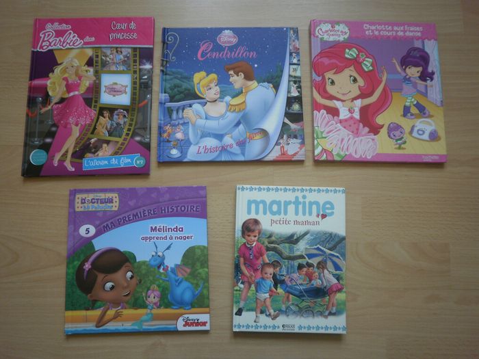 Bonjour, Je vends ce lot de 5 livres pour enfants en très bon état : - Cendrillon, l'Histoire du Film - Edition Disney Princesse - Charlotte aux Fraises et le cours de danse - Hachette Jeunesse - Docteur la Peluche "Melinda apprend à nager" - Barbie "Coeur de Princess" - Martine petite Maman - Editions Atlas Jeunesse Lot entier proposé à 10€ ou bien vente à l'unité possible au prix de 2.50€ le livre.