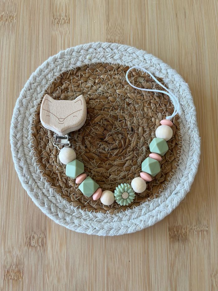 Attache tétine Perles verte, rose & bois Clip renard en bois & petite fleur NEUVE AVEC ÉTIQUETTE ! Pour toute demande, n’hésitez pas à m’écrire !