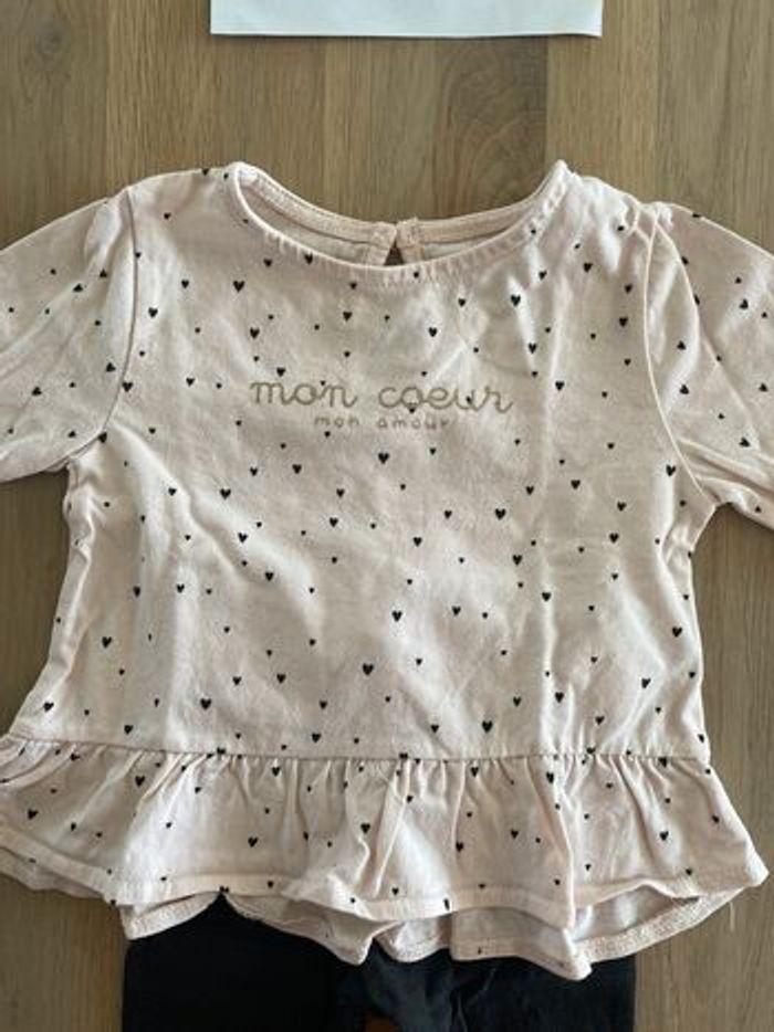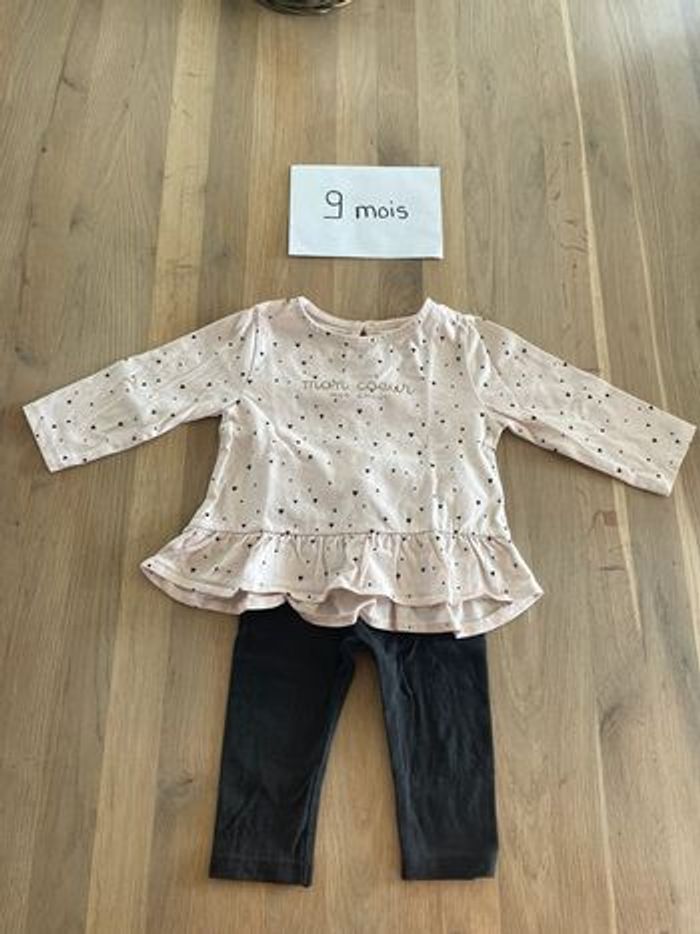 Ensemble composé d’un t-shirt à manches longues rose clair motif cœur + legging noir 9 mois Kiabi Très bon état