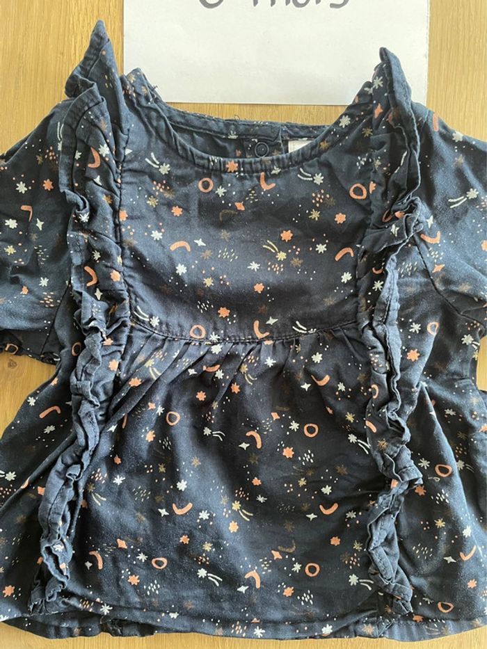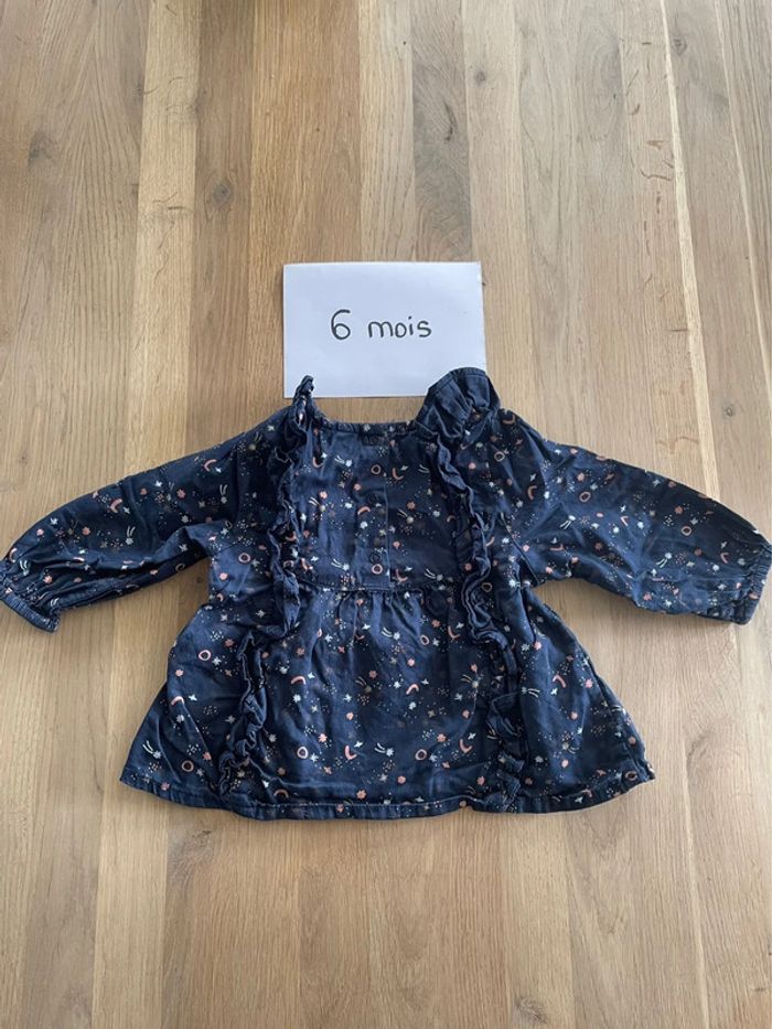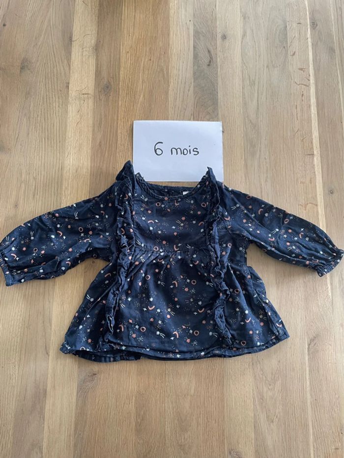 T-shirt à manches longues bleu marine motifs rose clair et blanc Tape à l’œil 6 mois Très bon état