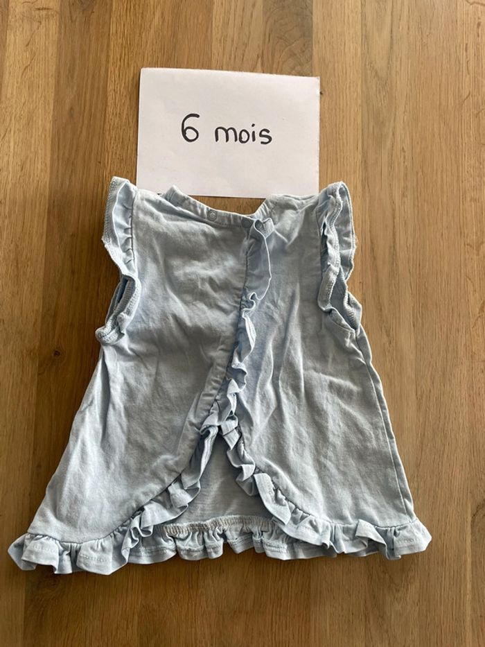 T-shirt sans manches bleu clair motif fleurs blanches, semi ouvert dans le dos Tape à l’œil 6 mois Très bon état