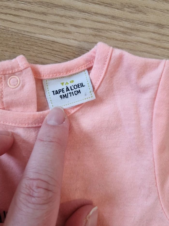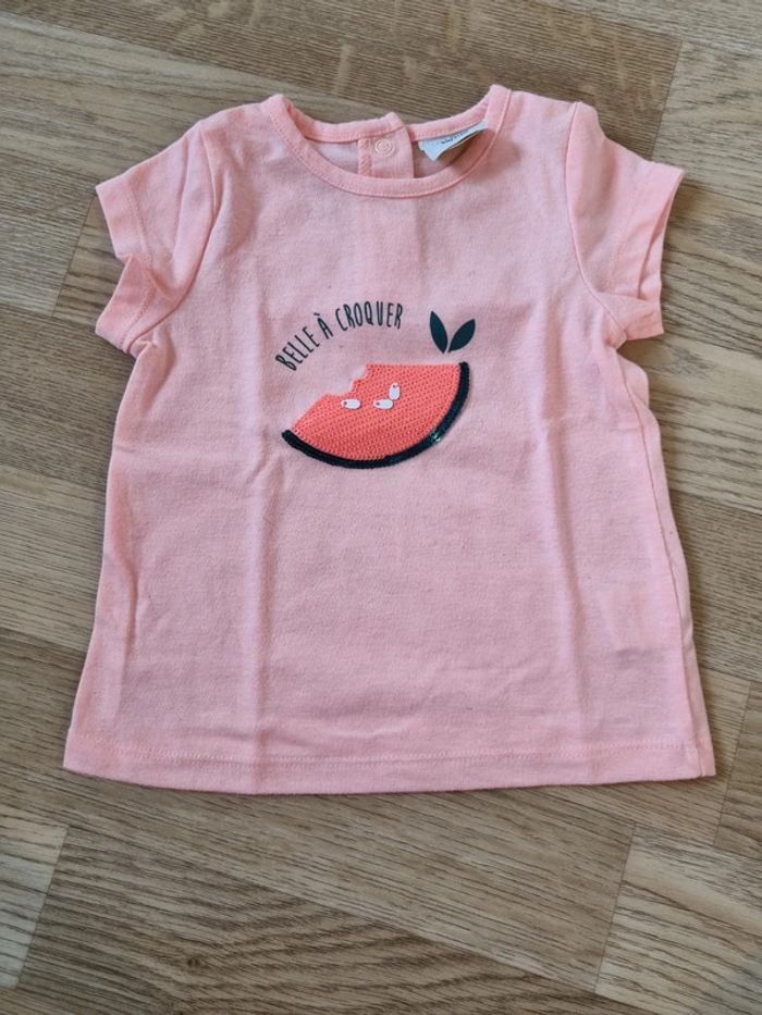 Tee shirt couleur corail Motif sequin pastèque et écriture belle à croquer 2 boutons pressions dans le dos Marque Tape à l'oeil Très bon état