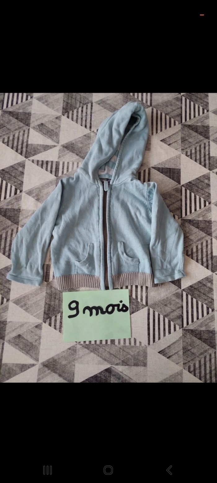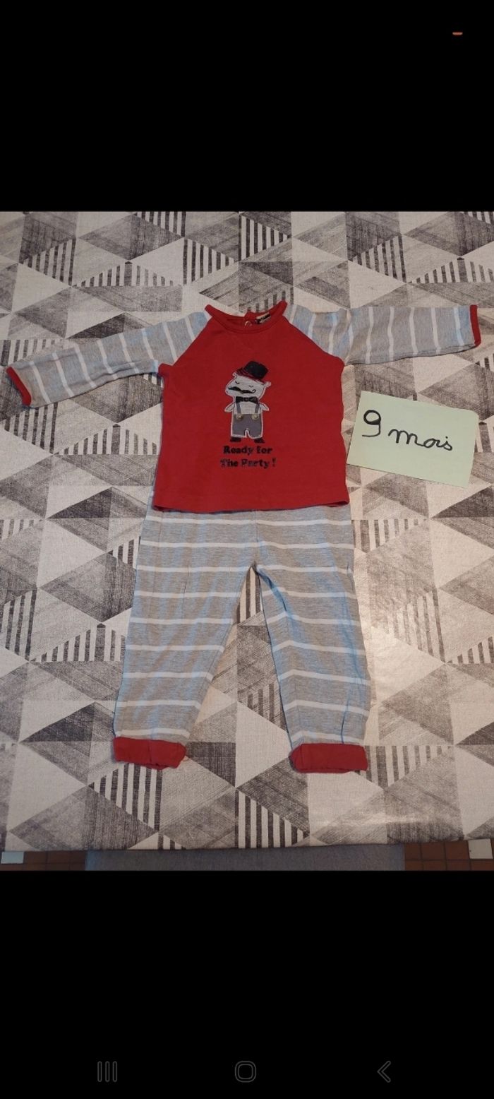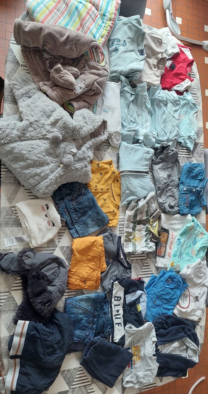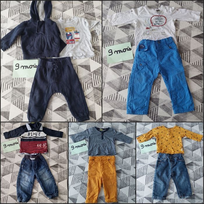 Lot complet 9 mois garçon. Le tout est en très bon état. Le lot est composé de 31 pièces : - 4 ensembles (haut + bas) - 1 ensembles de sport (haut + bas + gilet) - 2 chemises - 3 tee shirts manche courte - 2 pyjamas velours - 1 pyjama Coton en 2 pièce - 6 bodies manche courte - 1 gilet - 1 veste neuve sans étiquette - 1 combi polaire + bonnet noukies neuf - 1 combi polaire avec jambes amovible + gants - 1 bonnet Vend le lot uniquement.