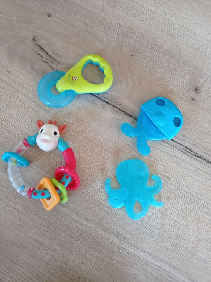 4 jeux de dentition, dont 3 avec liquide à mettre au frigo 2 Sophie la Girafe, 1 Nuk, et 1 Bébé Confort