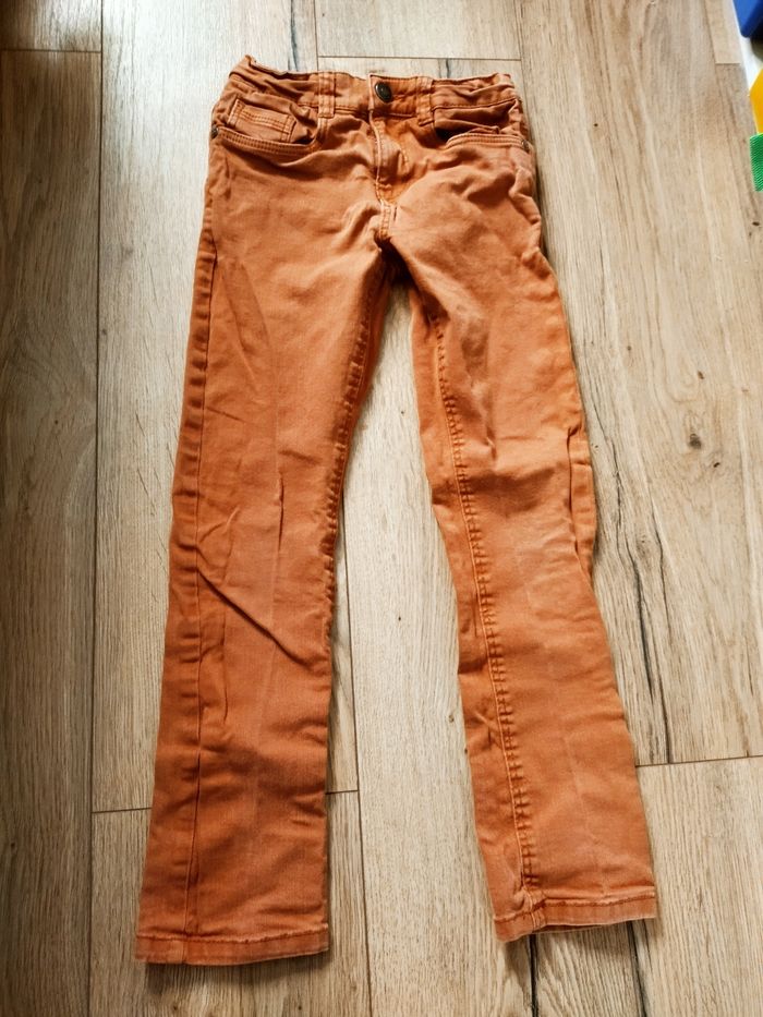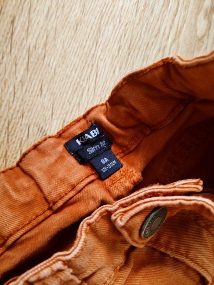 Jean rouge rouille ferme avec une pression taille 8 ans Kiabi slim fit On peut régler la taille