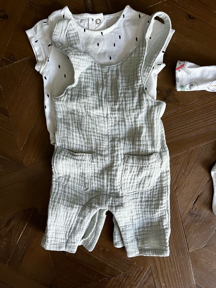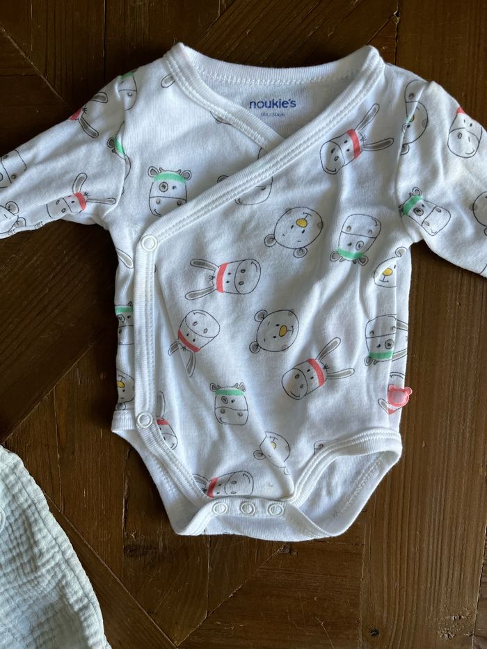 Lot naissance un bodie noukies thermoregulant (prix presque 20€ neuf) il est idéal pour la naissance, servi une fois car grand bébé. Un ensemble combi vert d’eau légère (comme gaz de coton) + bodie blanc marque kiabi
