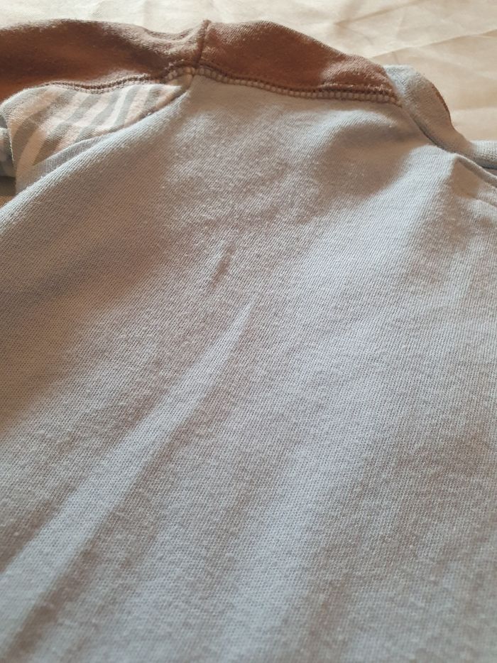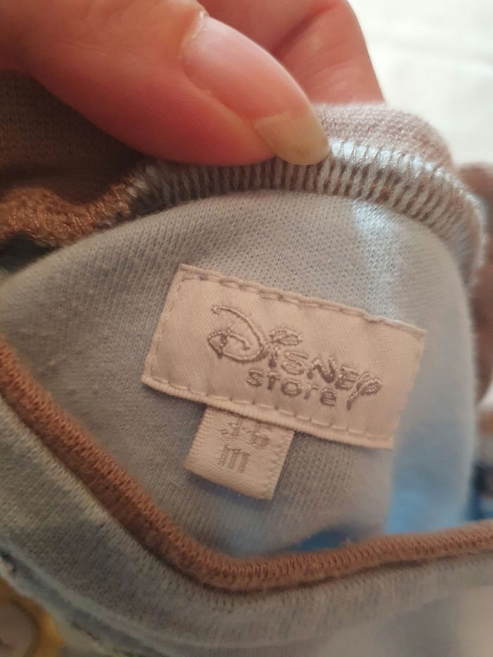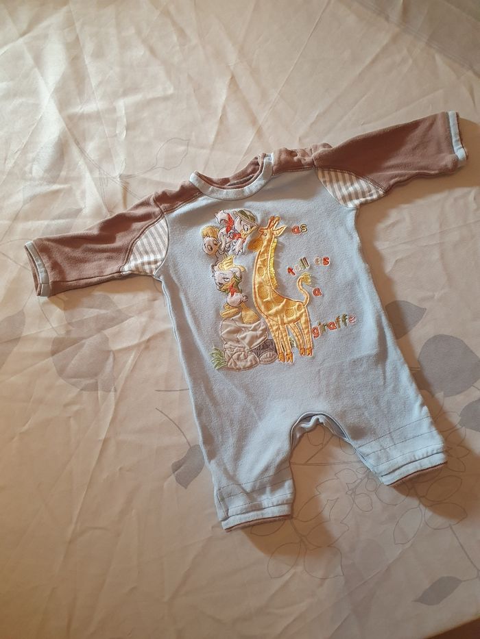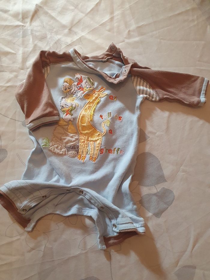 Pyjama bleu et marron, avec jolie broderie avec Riri, Fifi, Loulou et une girafe. Ouverture par pressions au col et à l'entrejambe. Porté plusieurs fois, il reste en bon état. Un peu bouloché (voir dernière photo). Taille 3 à 6 mois, marque Disney.