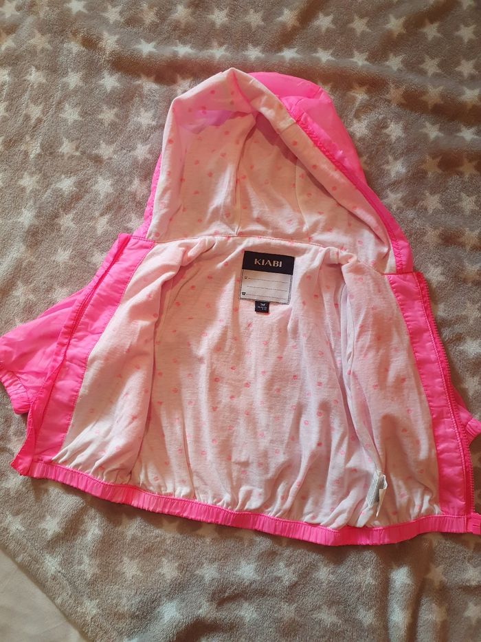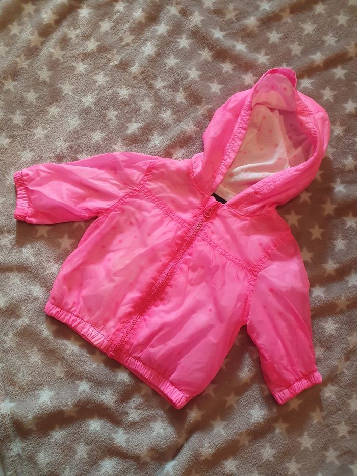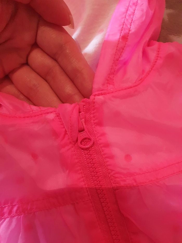 Veste légère à capuche, rose fluo, motif de la doublure visible en transparence. Doublure blanche motif pois et cœurs. Fermeture par zip, avec protection. Type imper, mais je ne suis pas sûre qu'elle soit vraiment imperméable, tellement elle est fine. Manches élastiques au niveau des poignets, bas élastique aussi. Extérieur 100% polyamide, doublure 65% polyester 35% coton. Très peu portée, elle est en excellent état. L'étiquette prénom est intacte. Taille 3 mois, marque Kiabi.