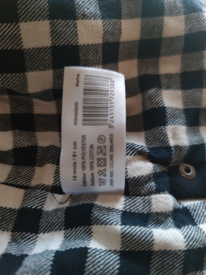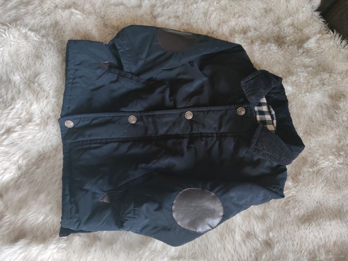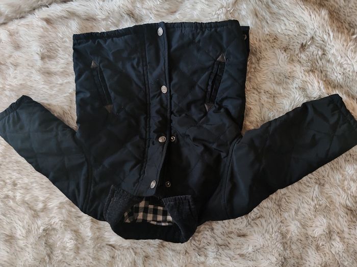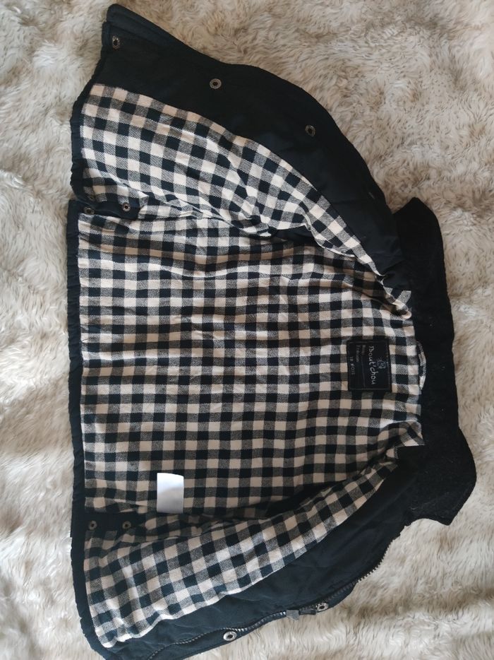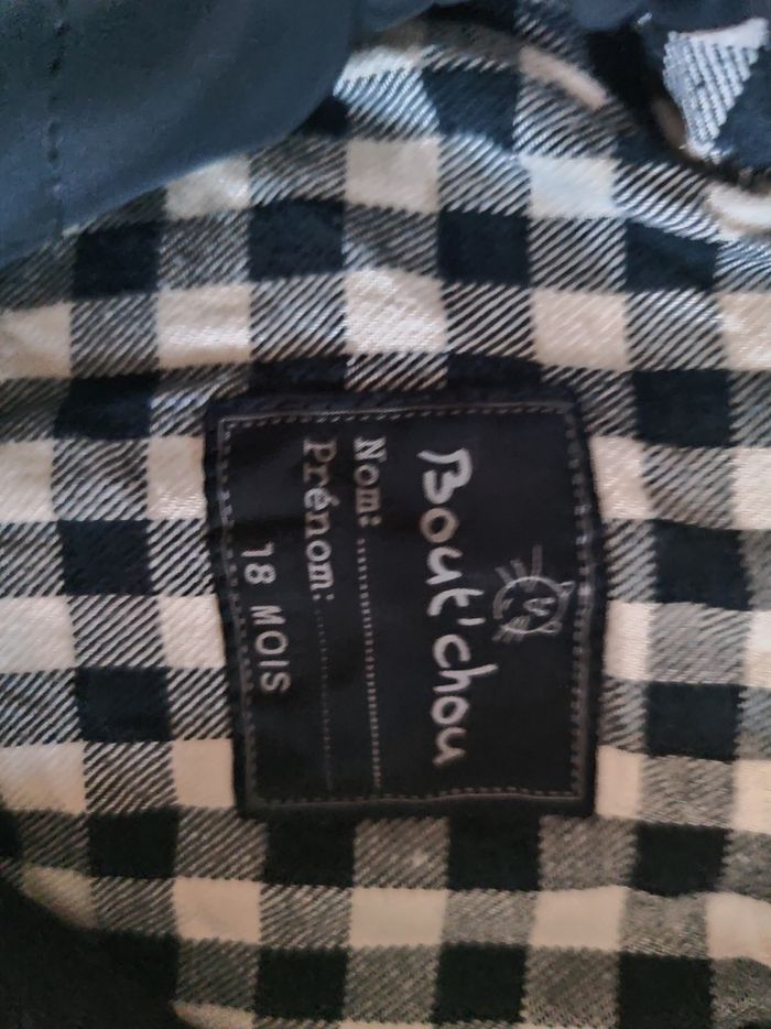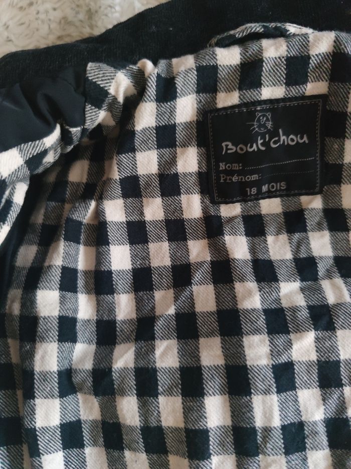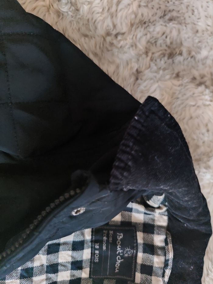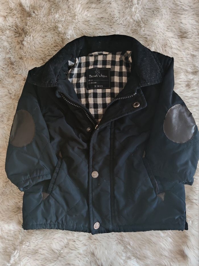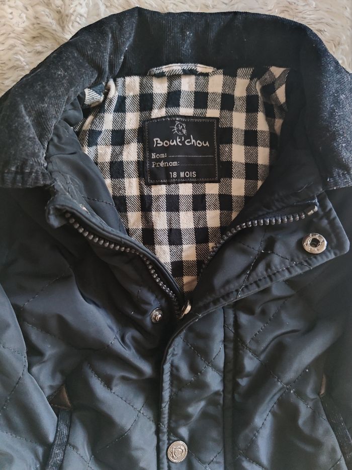 Manteau automne hiver 18 mois, marque Bout'chou (Monoprix), matelassé noir avec doublure à carreaux noirs et blancs, col en velours noir. Zip + boutons pression. En très bon état Réduction sur les lots