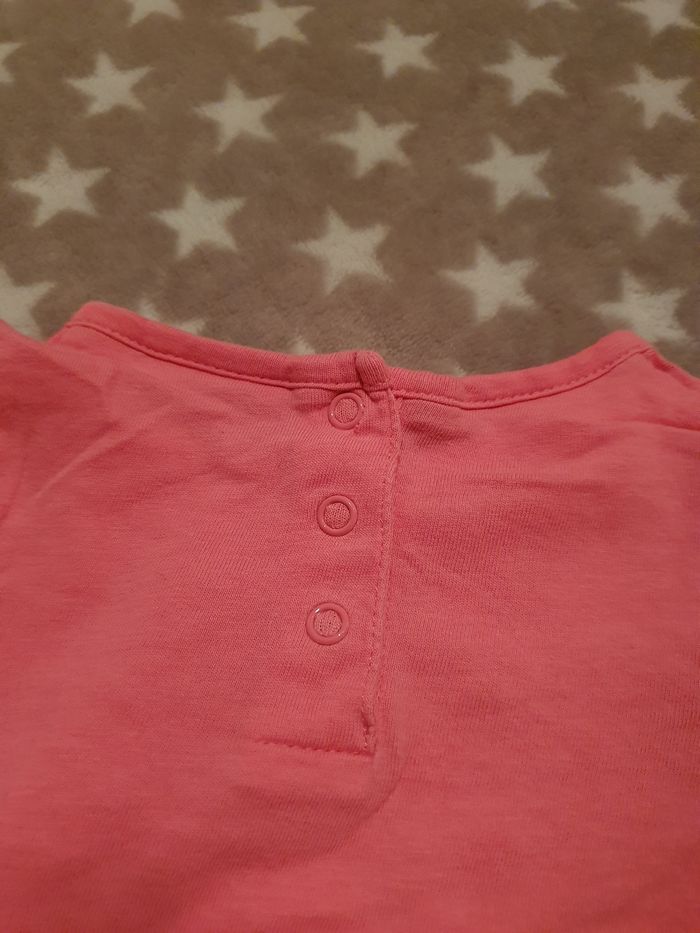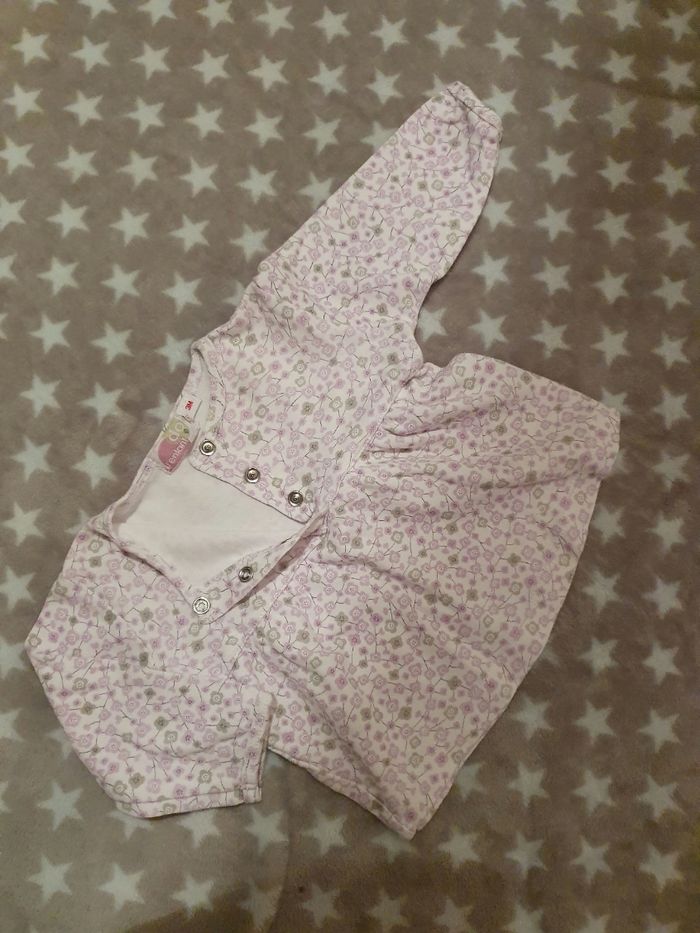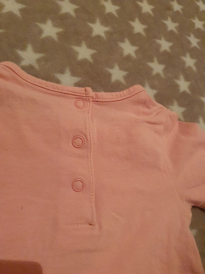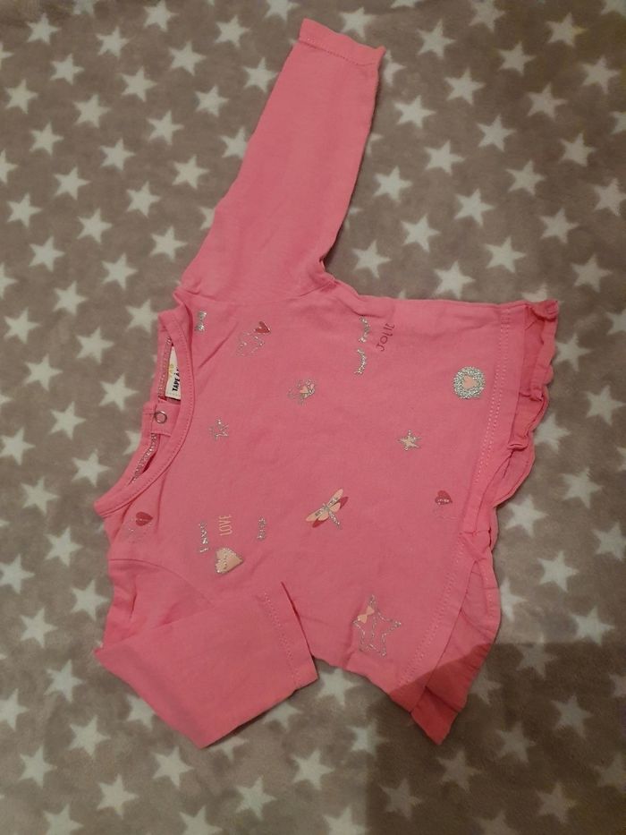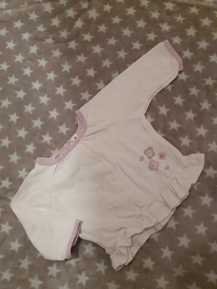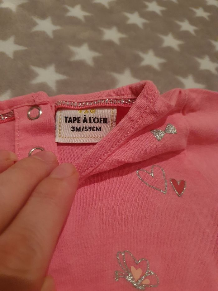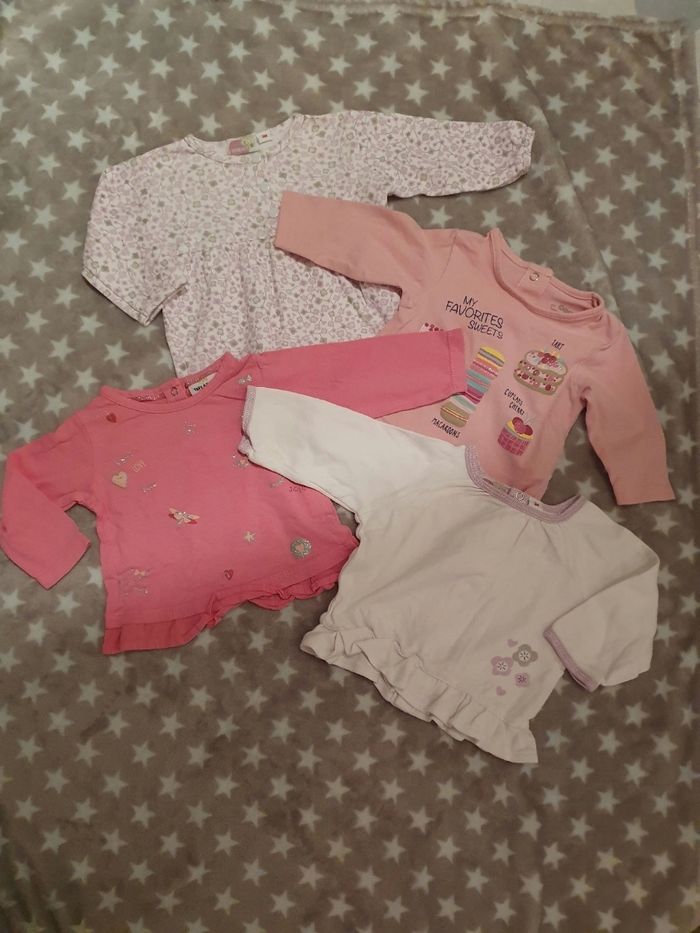Lot de quatre t-shirts à manches longues, tons rose et violet. Un blanc à motif floral violet, ouverture par trois pressions à l'avant. Marque L'enfant Do. Un rose à motifs pailletés, ouverture par trois pressions à l'arrière, au niveaudu col. Marque Tape à l'œil. Un rose clair, floqué gâteaux pailletés, ouverture par trois pressions à l'arrière, au niveau du col. Marque Orchestra. Un blanc, encolure et bordure des manche mauves, imprimé fleurs mauves et grises en bas, ouverture par pressions dans le dos, de haut en bas. Marque L'enfant Do. Les quatre t-shirts sont en très bon état car peu portés. Taille 3 mois.