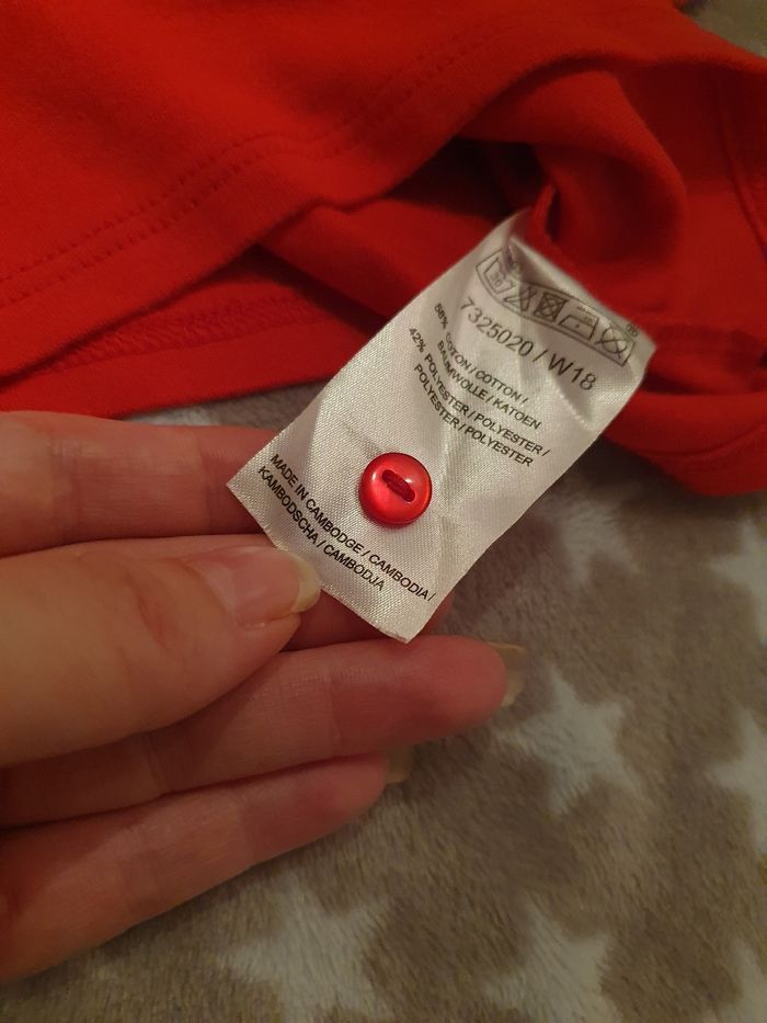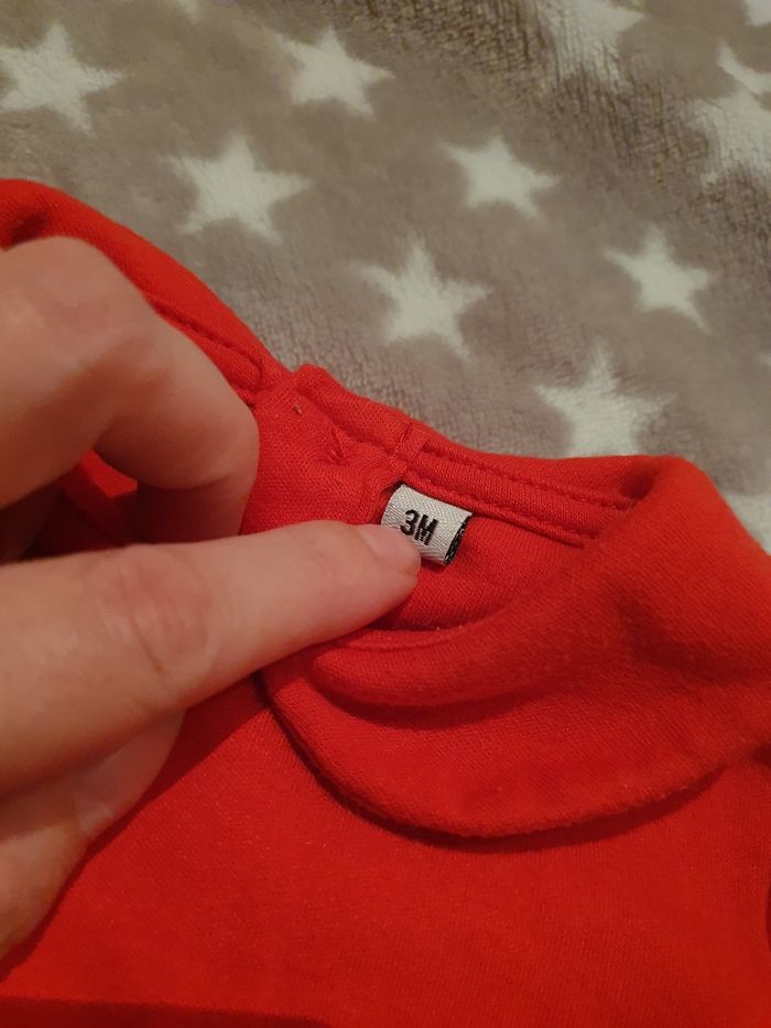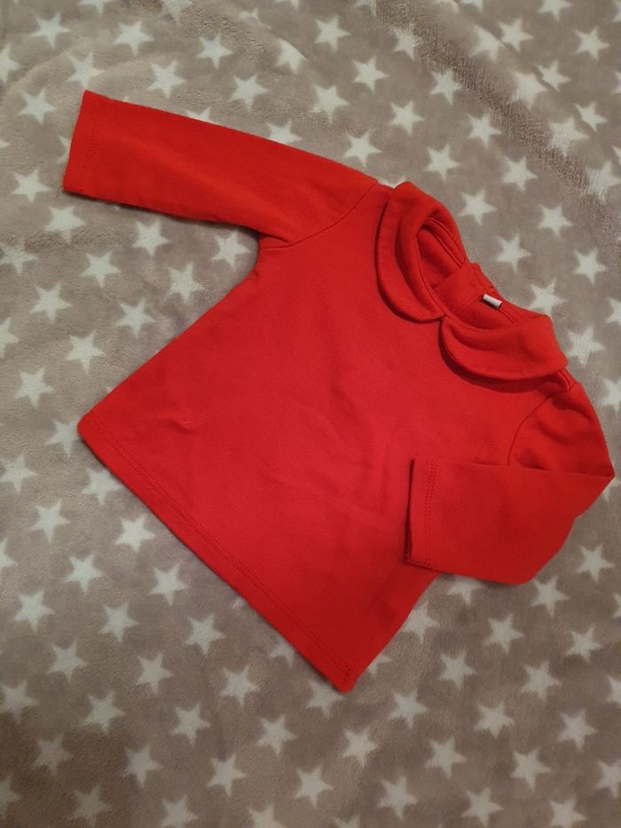 T-shirt rouge à manches longues, avec joli col. Ouverture par trois boutons à l'arrière du col. Très peu porté, il est en excellent état. Le bouton de rechange est toujours cousu sur l'étiquette intérieure. Taille 3 mois, marque inconnue. Attention : le rouge sort plus clair sur les photos !