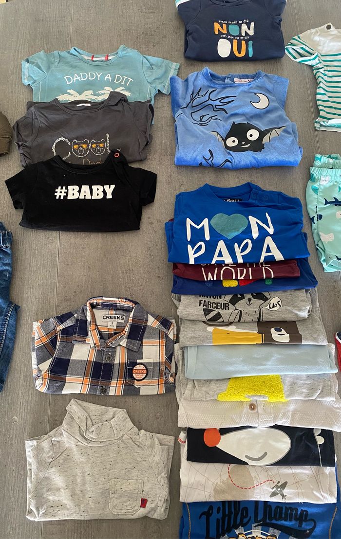 Lot 3 mois garcon comportant 12 t-shirt manches longue 3 jeans 3 t-shirt manche courte 2 pyjama ( le bleu fin « quant maman me dit NON… » c’est taille 1 mois ) 1 short avec chaussette (Symba) 2 ensemble t-shirt short 1 grenouillère 1 chemise 1 sous pull