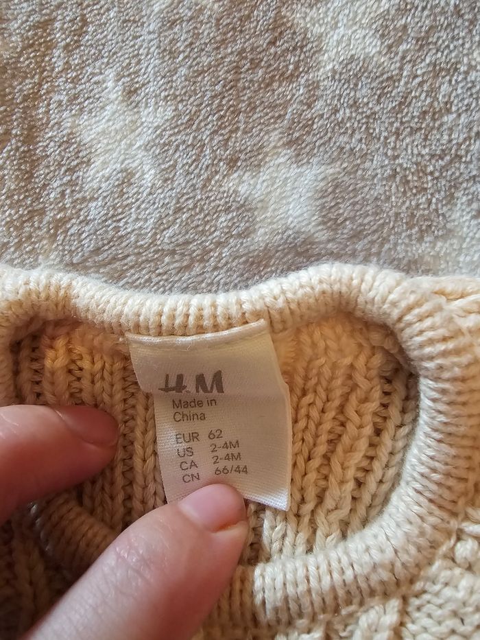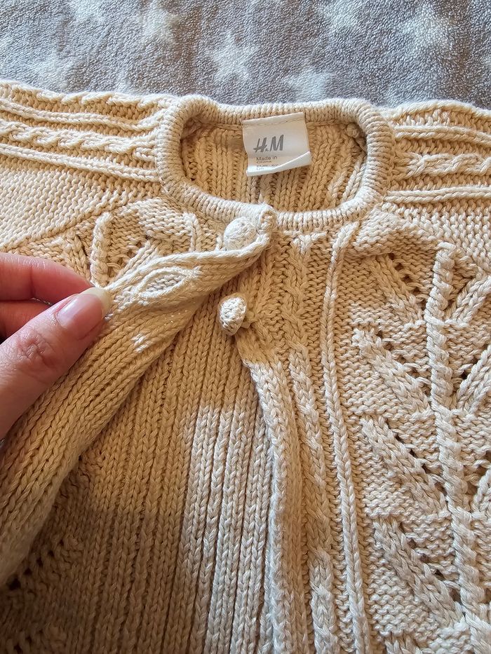 Gilet beige, ouverture par deux boutons au col. 100% coton. Très peu porté, il est en excellent état. Taille 2-4 mois, marque H&M.