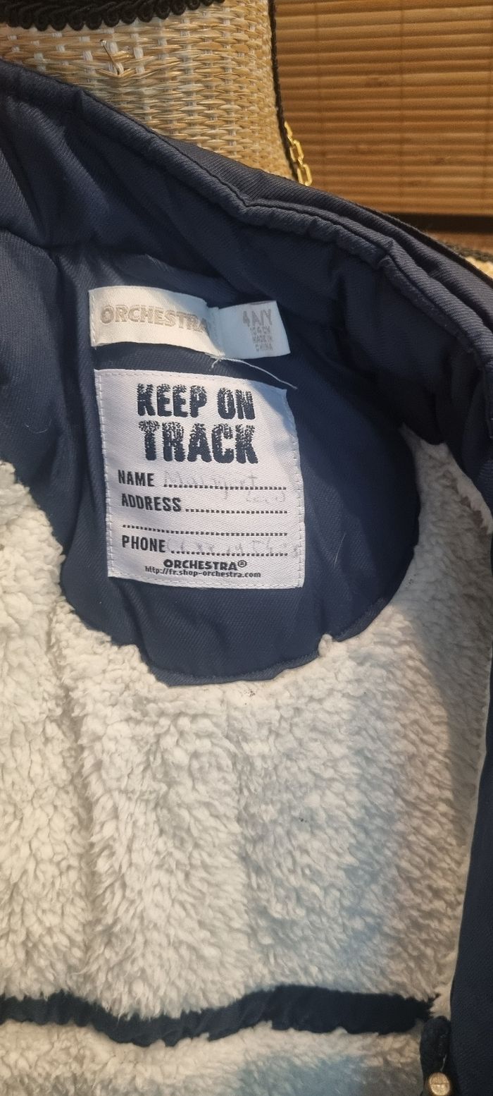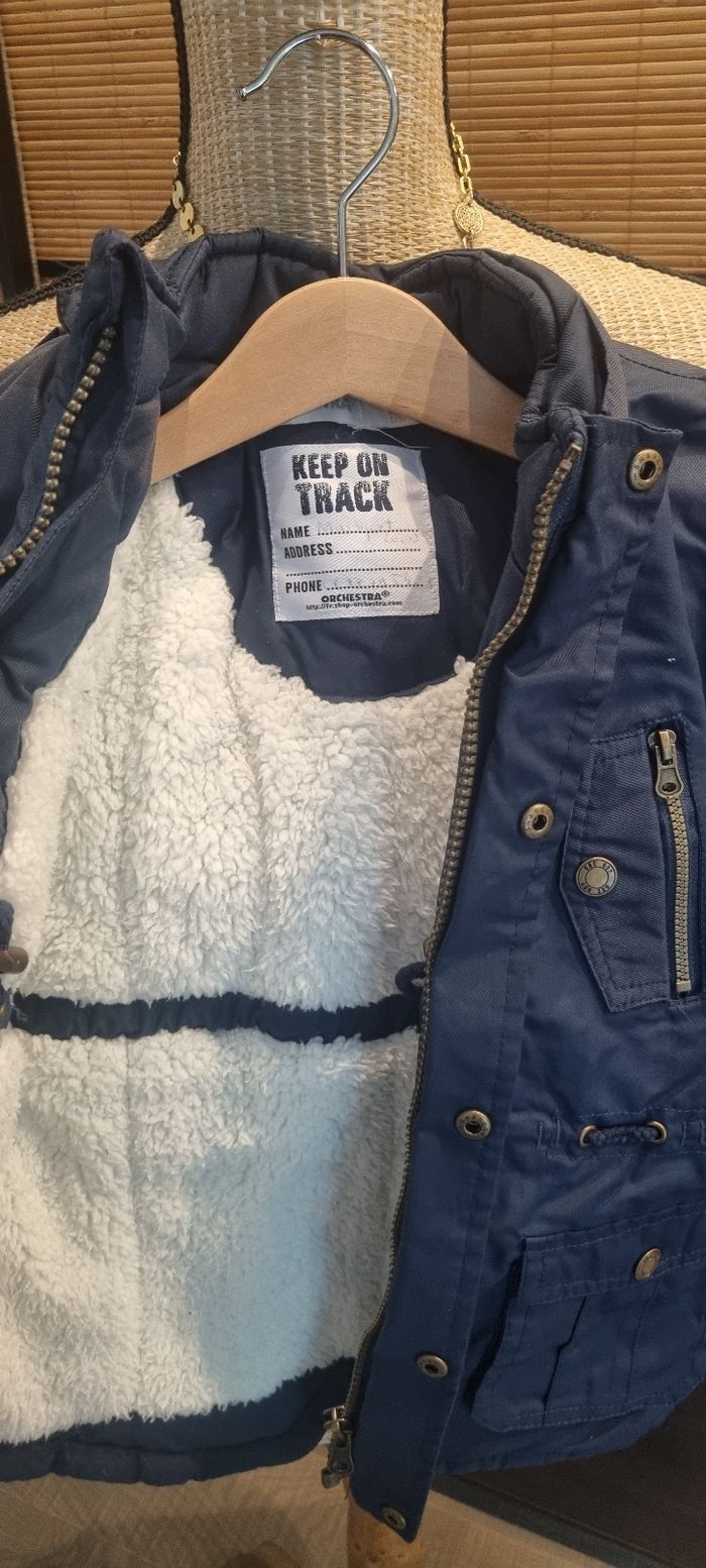 Manteau bleu marine Orchestra 4 ans Manque la capuche Epais et chaud En très bon état, pas de tâche, pas de trou