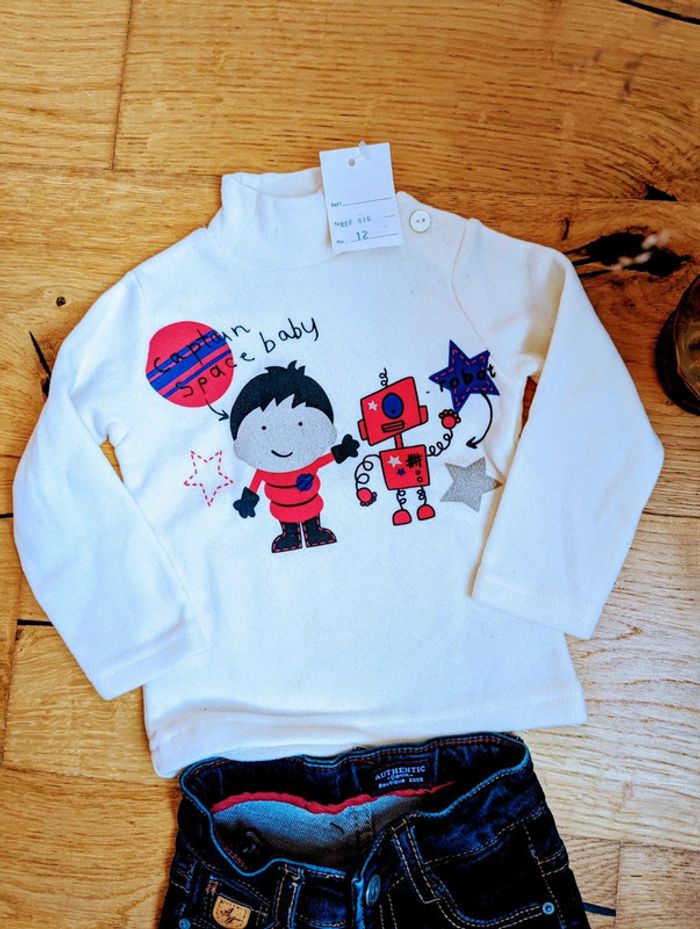🌼Haut col roulé/ cheminé / haut effet molletonné tout doux (intérieur /extérieur) + jean/denim bleu foncé élastique pour réglé la taille Parfait pour la mi saison et l'hiver 🌼Neuf avec étiquette 🌼Couleur : beige / rouge/ marron / marine 🌼Taille : 12 mois