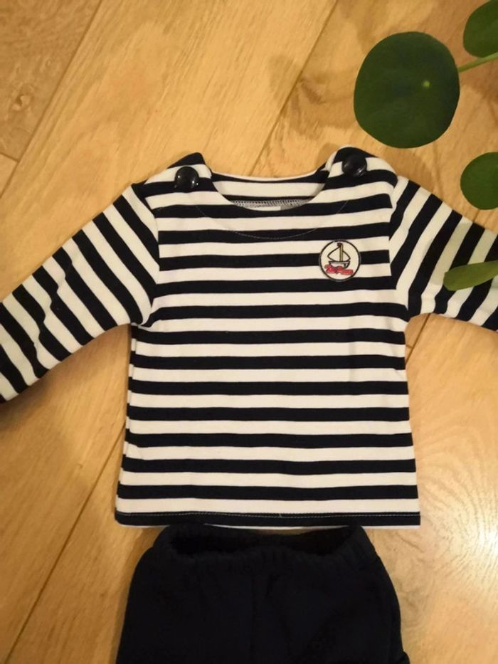🌼Détails: ensemble / lot parfait pour l'hiver T-shirt mariniere molleton Pantalon jogging avec une poche sur la jambe gauche Ecusson avec un dessin de petit bateau / voilier 🌼Couleurs : bleu Marine blanc 🌼Taille : 12 mois