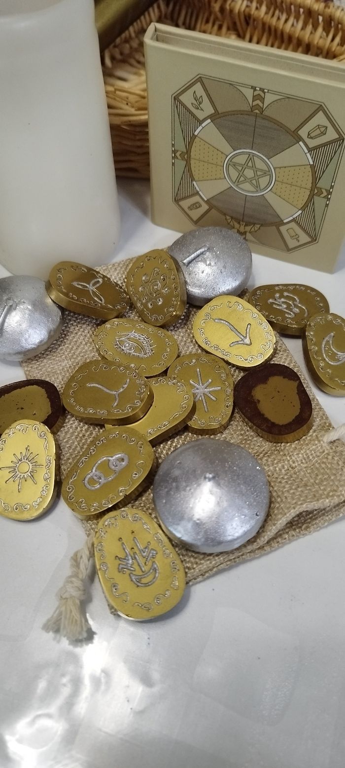 Jeu de runes wicca Couleur or et blanc Vendu dans leur pochon en toile de jute et livret de tirage runique
