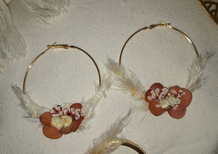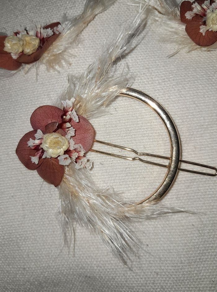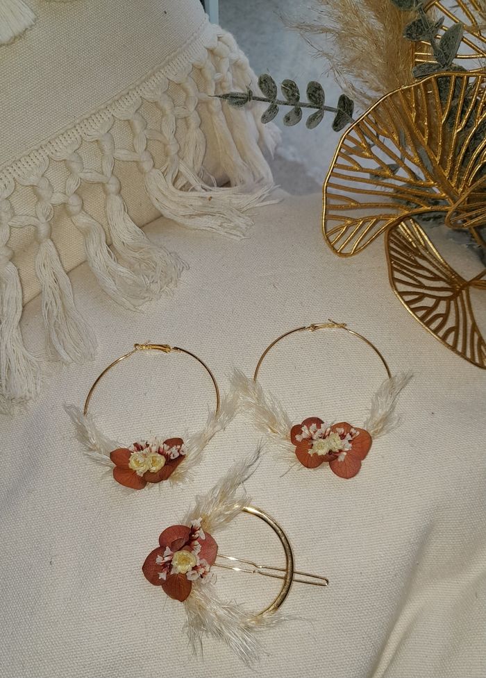 Ensemble boucles d'oreilles et pince à cheveux Je vous propose ce bel ensemble de bijoux agrémenté de fleurs séchées et stabilisées. Dans les tons vert, terracota, beige, blanc. Ensemble composé : - 1 paire de boucles d'oreilles rondes - 1 pince à cheveux ronde Parfait lors de votre mariage, une cérémonie, une soirée, un cocktail, pour les fêtes de fin d'année.