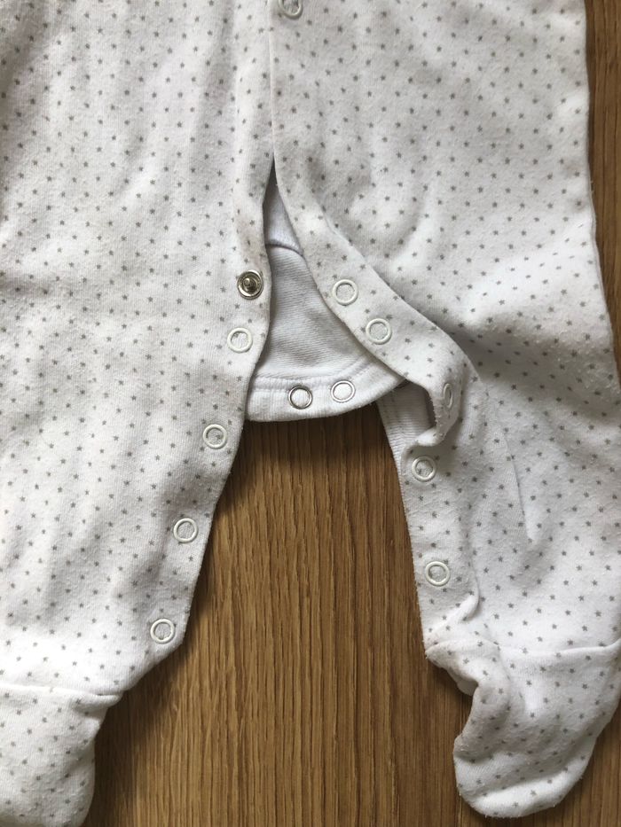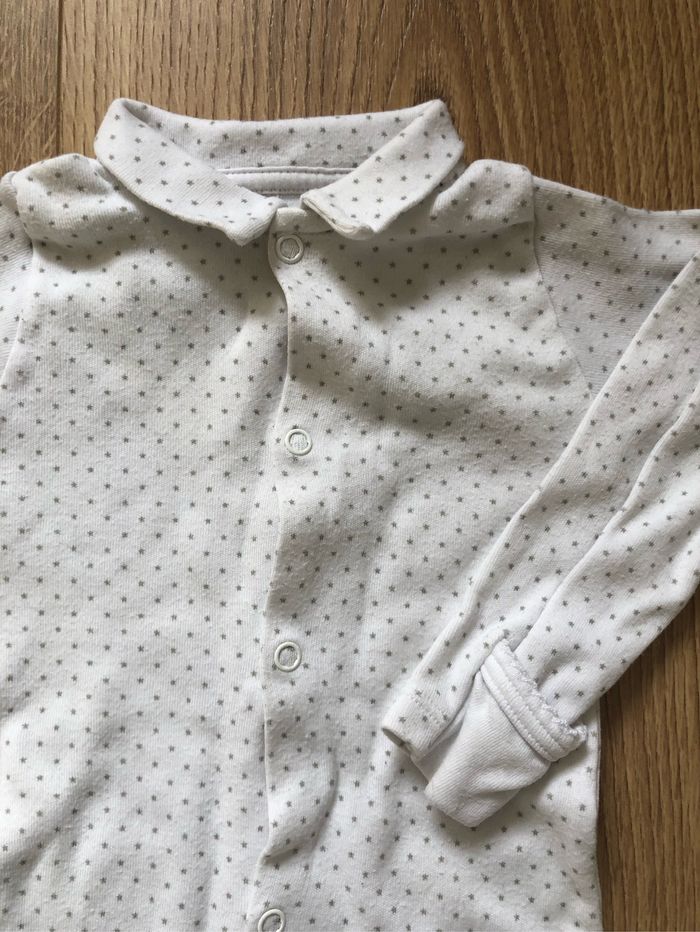 Superbe pyjama blanc à pois gris avec petit col Possibilité de retourner manche pour faire moufles